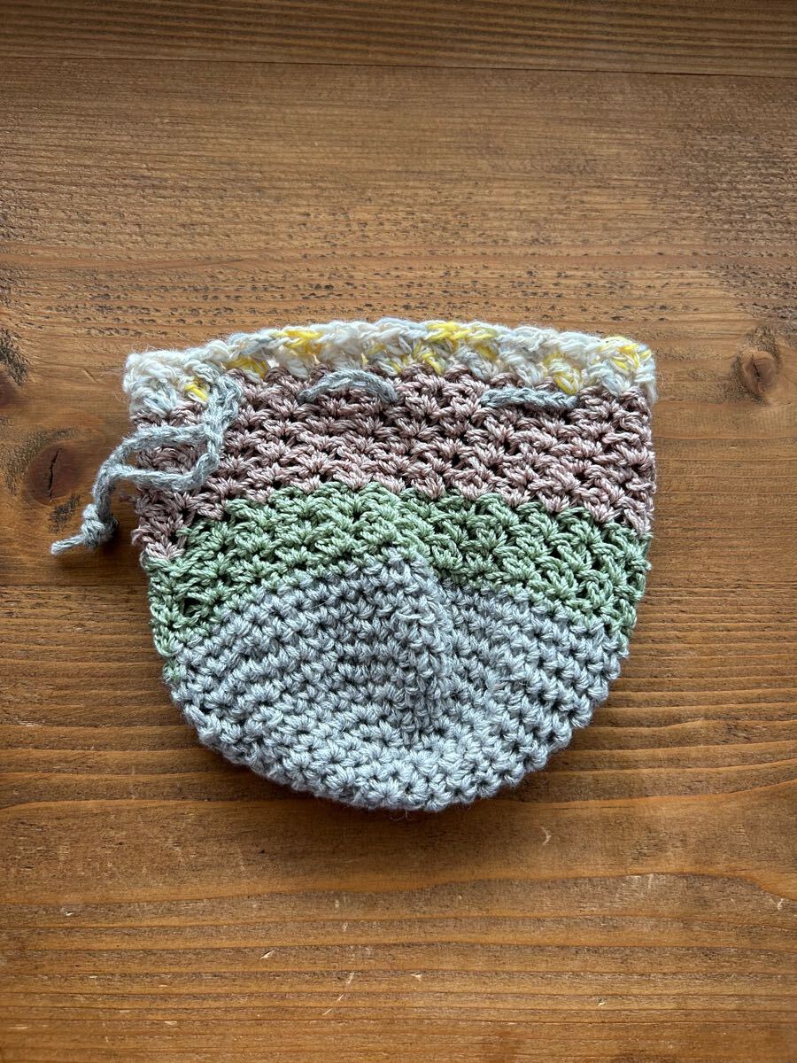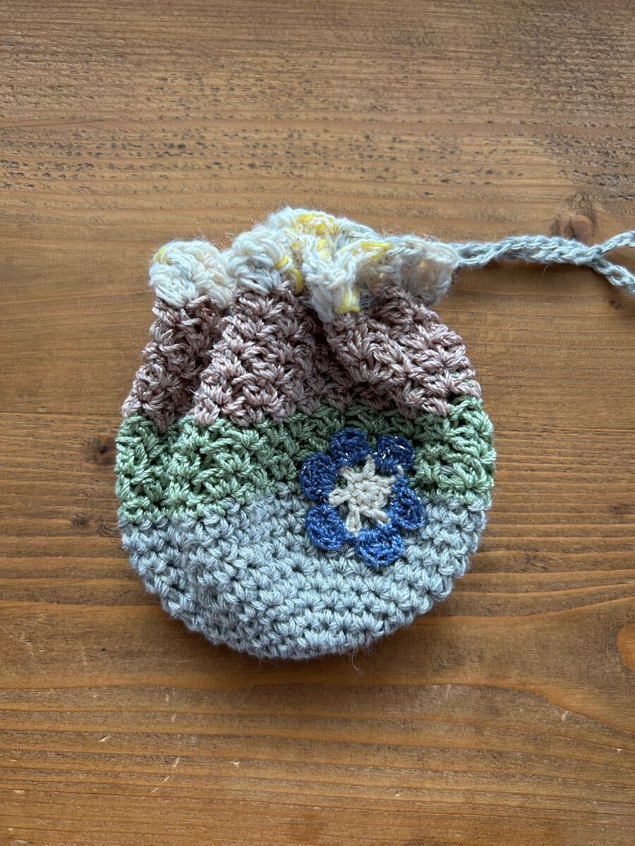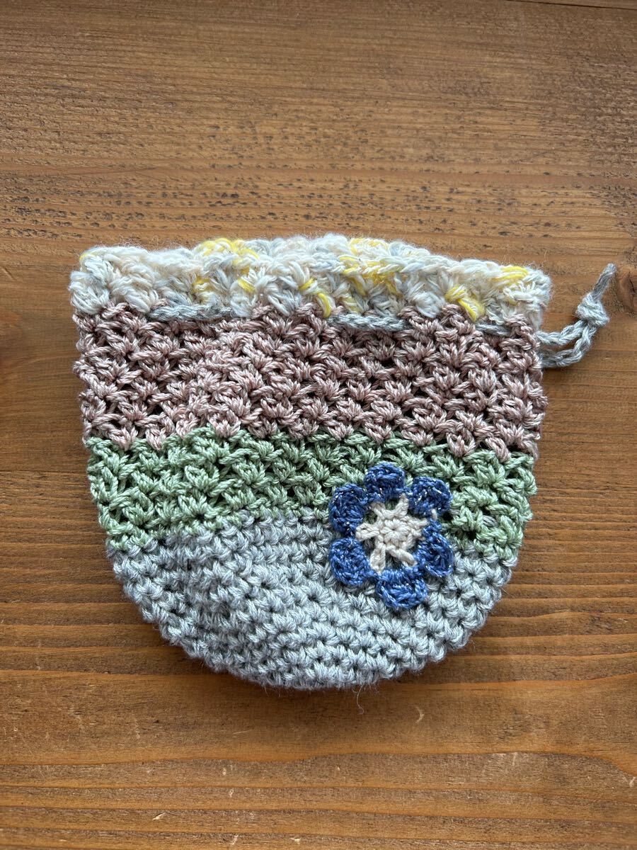 アクリルとポリエステルの糸でぷくぷくミニ巾着を編みました