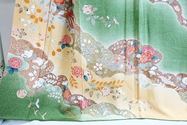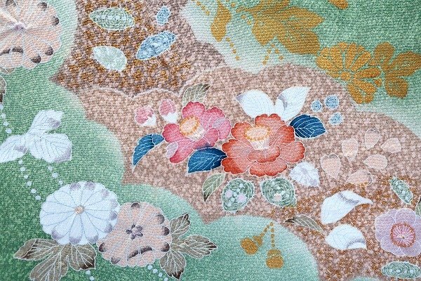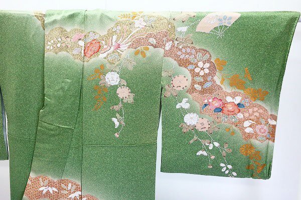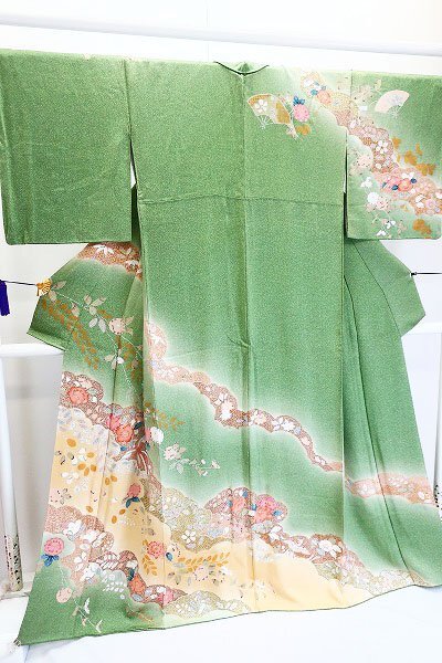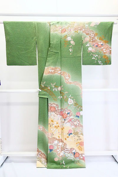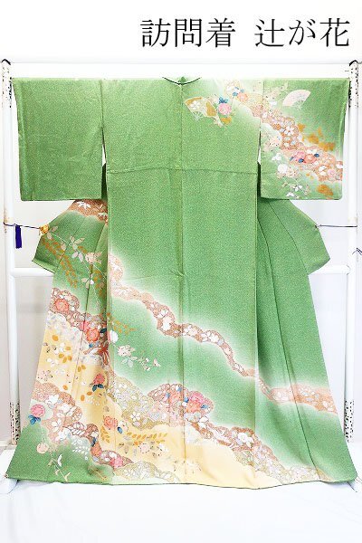 【送料無料】美品 訪問着 辻が花 浅緑色 たたき地 袷 身丈165.5cm トールサイズ お洒落 上品 正絹 仕立て上がり kimono 着物フィ m-7633 |