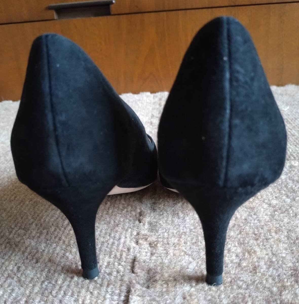 こちらのお色はブラックで素材はスウェード、サイズは6Bとありますから、23センチに相当するかと思います。底甲幅は約センチ、ヒール高さは約6.5センチとなっております。