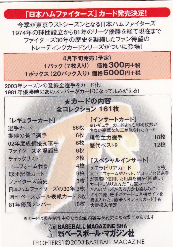88トレイ・ヒルマン監督◆BBM2003日本ハムファイターズ・プロモカード