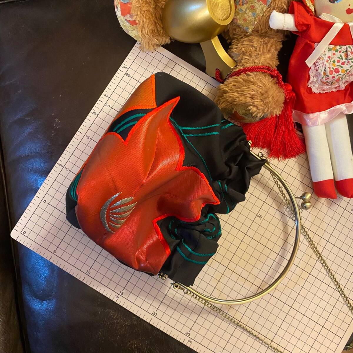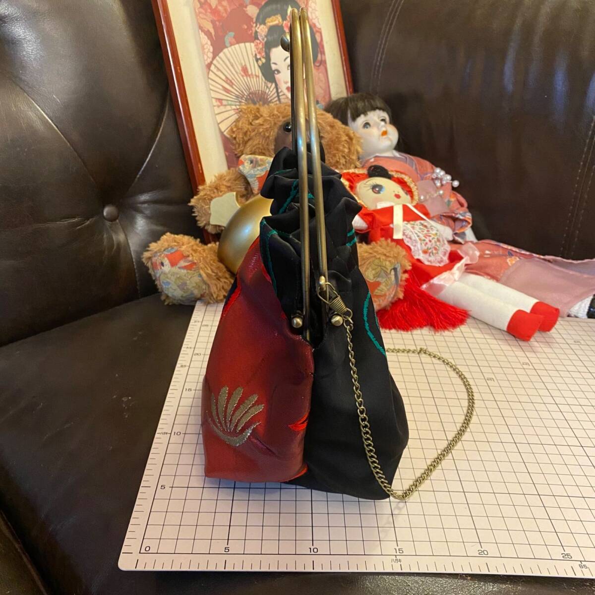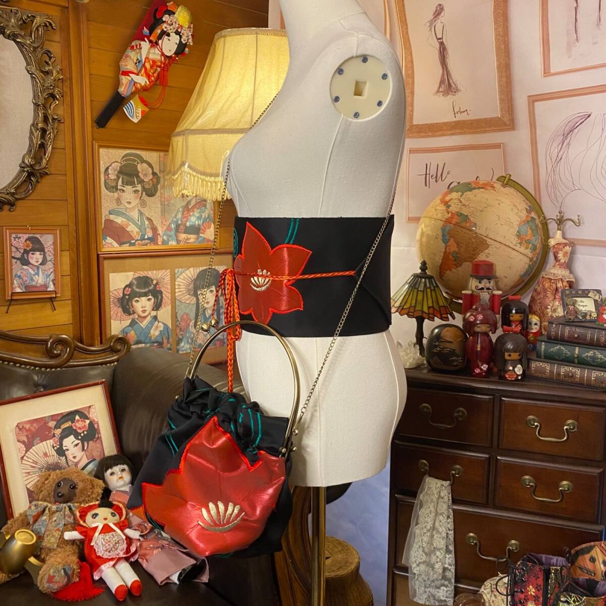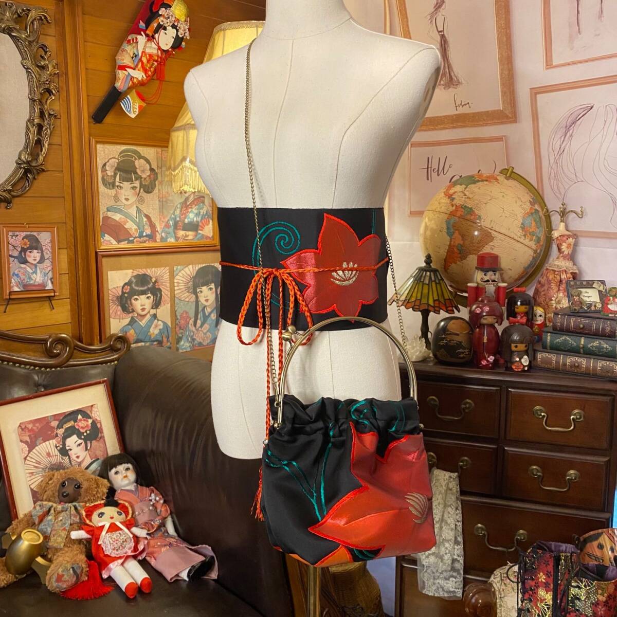 【和洋折衷 名古屋帯リメイク ハンドバッグ バック ショルダーチェーン付き ガマ口タイプ 帯サッシュベルト セット 紅蓮の花、漆黒に燃ゆる あ-83】