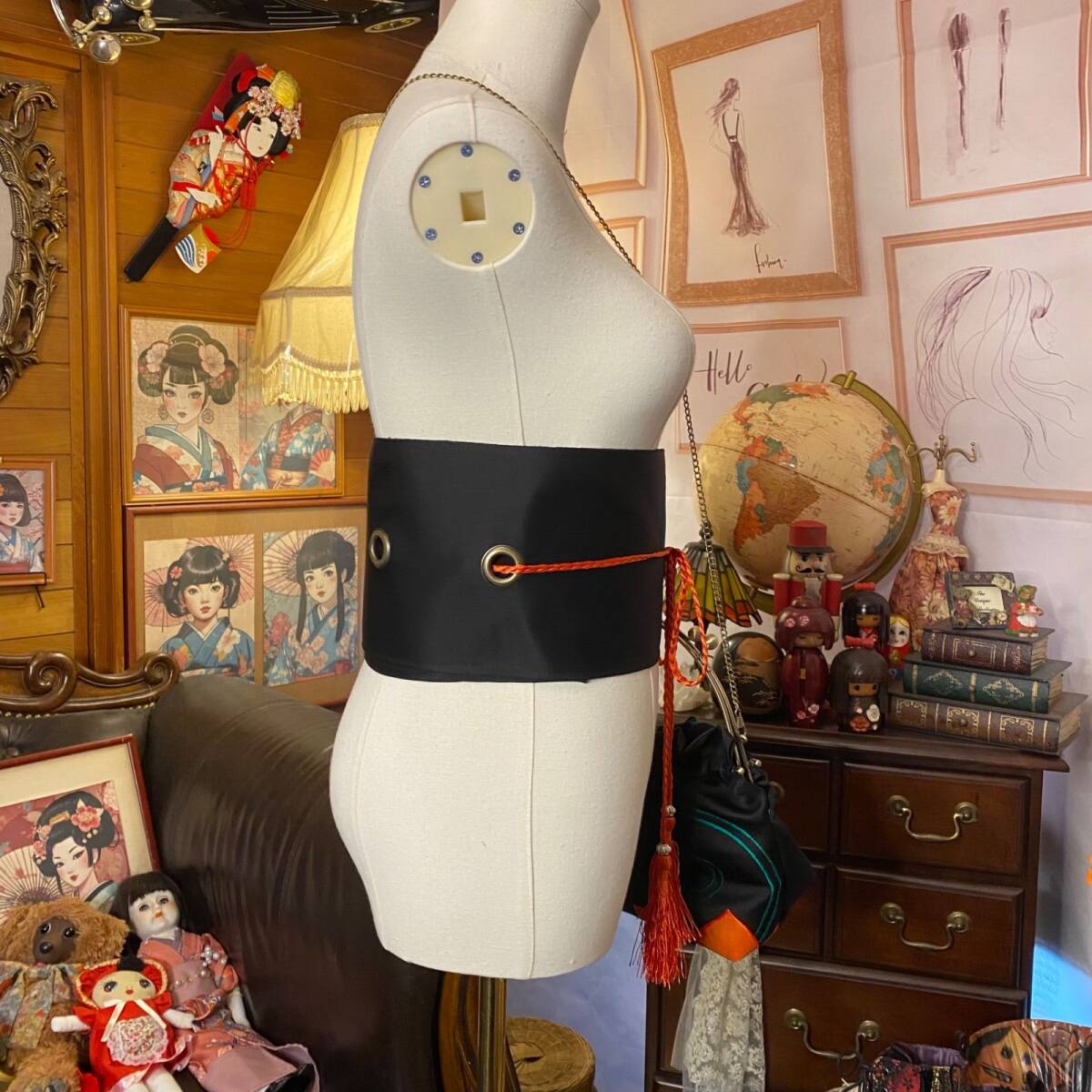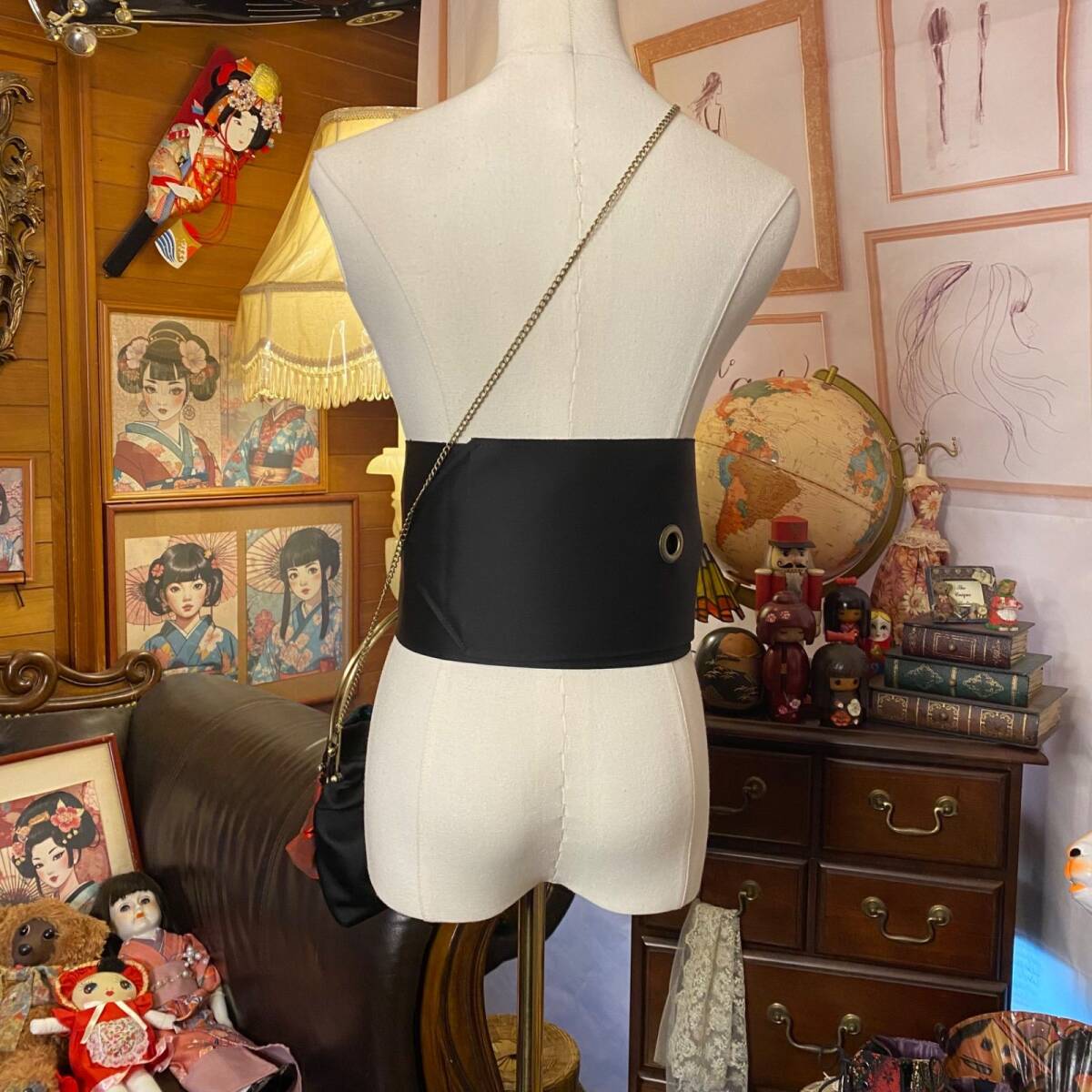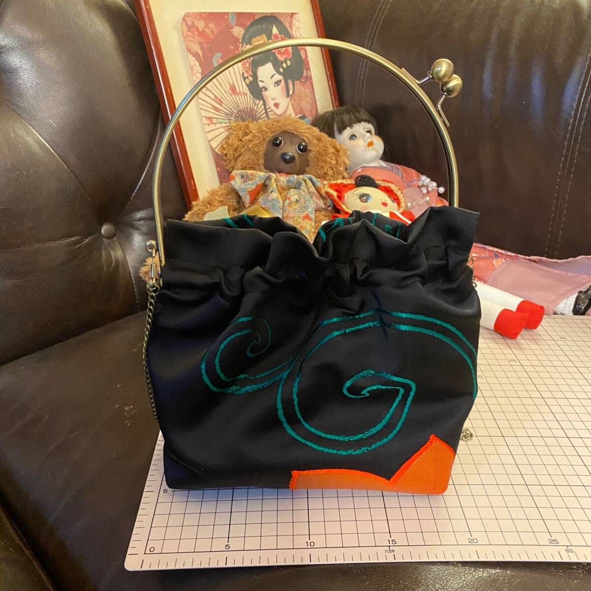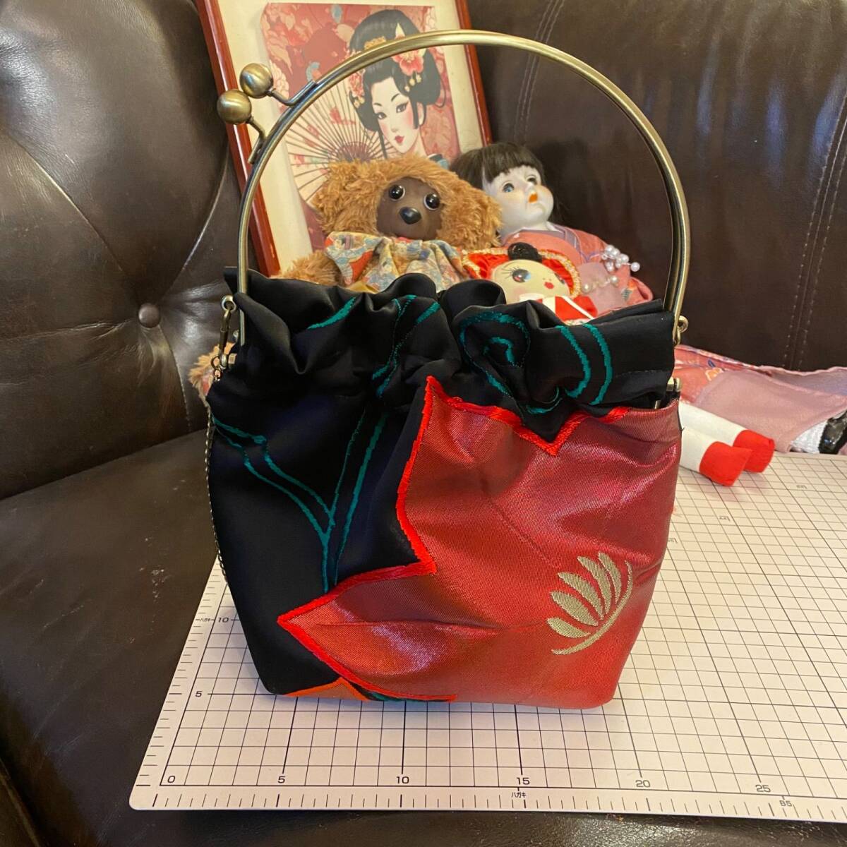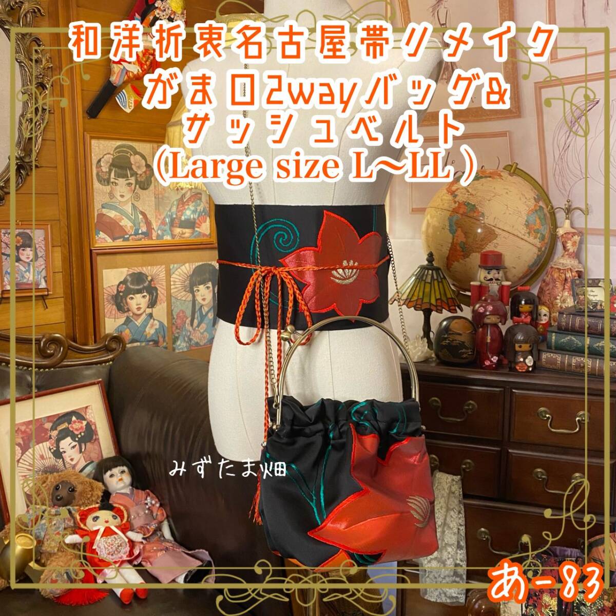 【和洋折衷 名古屋帯リメイク ハンドバッグ バック ショルダーチェーン付き ガマ口タイプ 帯サッシュベルト セット 紅蓮の花、漆黒に燃ゆる あ-83】