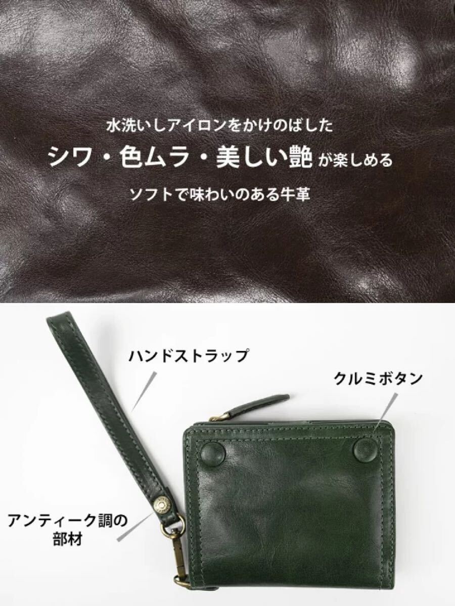 ●水洗いしアイロンをかけて色むらやシワをだした牛革を使ったクラッシックな雰囲気のあるシリーズのミドルサイズの二つ折り財布です。ソフトな手触りで美しい艶が楽しめます。
