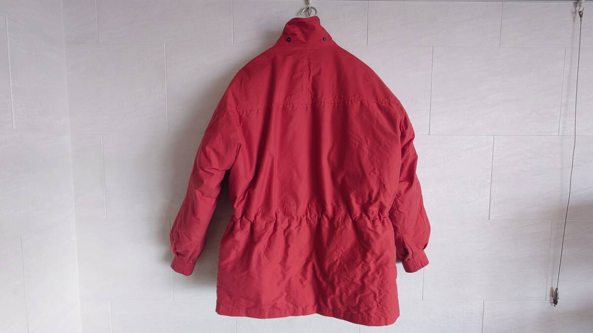 ゴアテックスのナイロンジャケットは写真では派手な赤っぽく写っておりますが、実際の商品は個人的主観ではありますが、もう少し落ち着いたトーンの殆どテカりがないオレンジ系の赤色です。収納は表地の左胸部分にジッパーポケット、下部部分にマジックテープ方式の2つのポケット、またその裏側には手を入れることが出来るポケットもあります。ドローコードが両腰部分に付属されています。