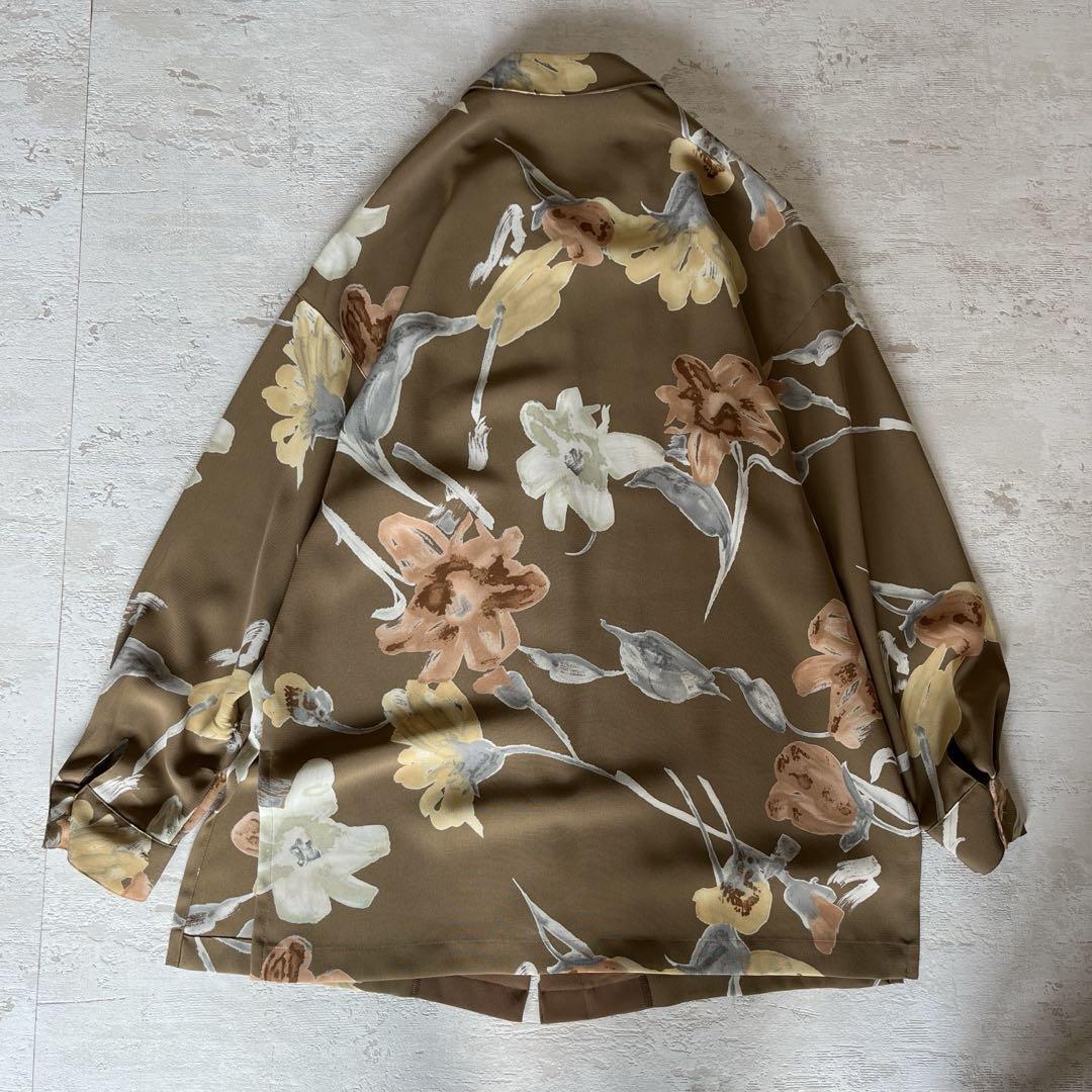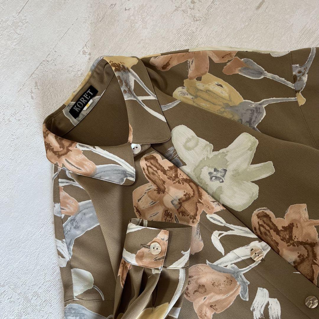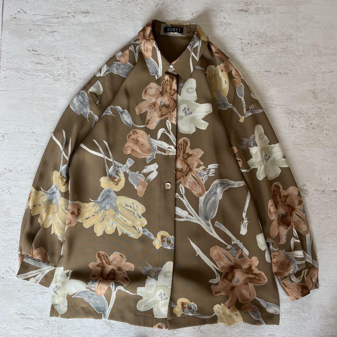 昭和レトロ手書き風花柄長袖ブラウスゆったり隠ボタンブラウンフリーサイズb1