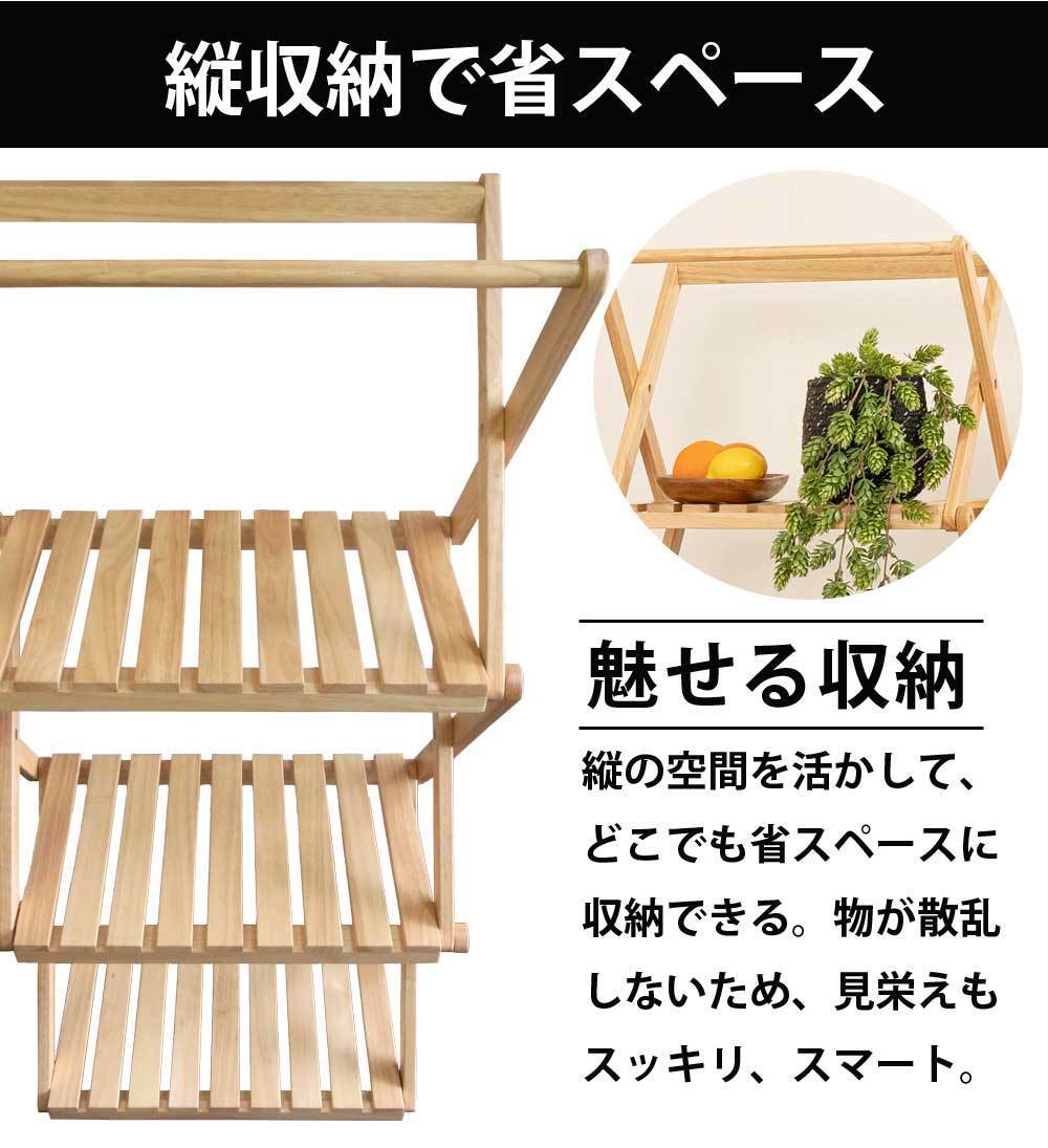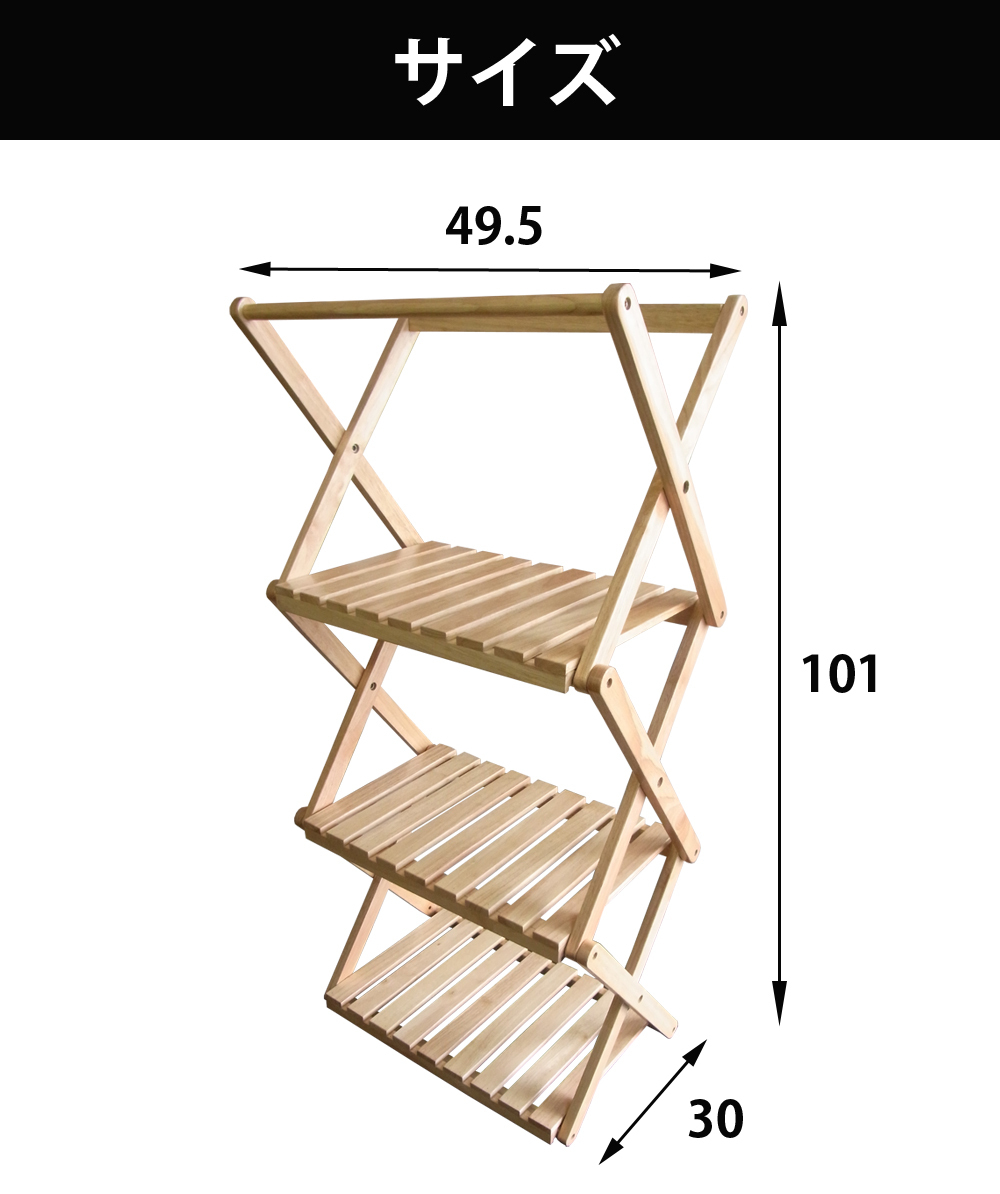 ゴチャついたアウトドアをスマートに変える、 ナチュラルウッドのキャンピングラック キッチン周りやチェアーのサイドテーブルなどマルチに使える便利なアイテム。 縦収納でスリム・省スペース ・魅せる収納 縦の空間を活かして、どこでも省スペースに収納できる。物が散乱しないため、見栄えもスッキリ、スマート。 ・物が取りやすい 物の種類ごとに置く段数を分けることで、暗がりでも置いた場所が把握しやすい。高い位置に物を置けるため屈まずに取りやすい。 横置きでどこでもテーブルに 室内室外を問わず、どこにおいても様になる木目調テーブル。 3枚の天板になることで、しっかりと固定されるので安定したテーブルに早変わりします。 持ち運びに便利な折りたたみ式 コンパクトに折り畳んで収納することができ、移動や片付けも簡単。必要な時にサッと取り出して使用できます。 持ち運びも簡単なので、ツーリングやソロキャンプなど、荷物を多く持っていけない場合でも重宝します。 室内外問わず活躍 シンプルなデザインと使いやすさで、室内でも野外でもさまざまな用途で活躍します。 室内のインテリアにもなじみやすい天然木の自然な風合い。 ナチュラルな風合いのため、キッチンやリビング、ちらかりやすい子供部屋や学習部屋などでもすっきり収納できます。 | ||||||||||||||||