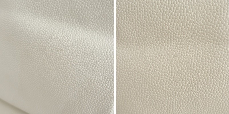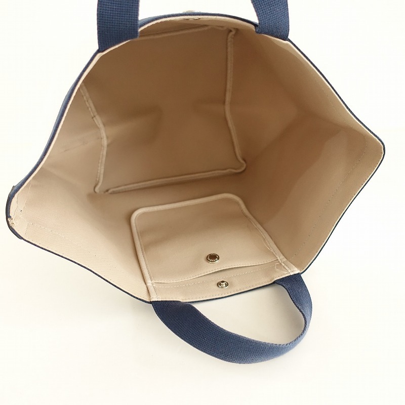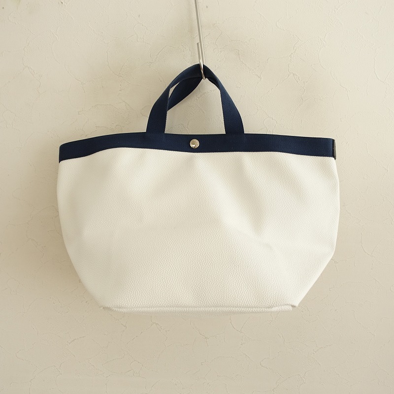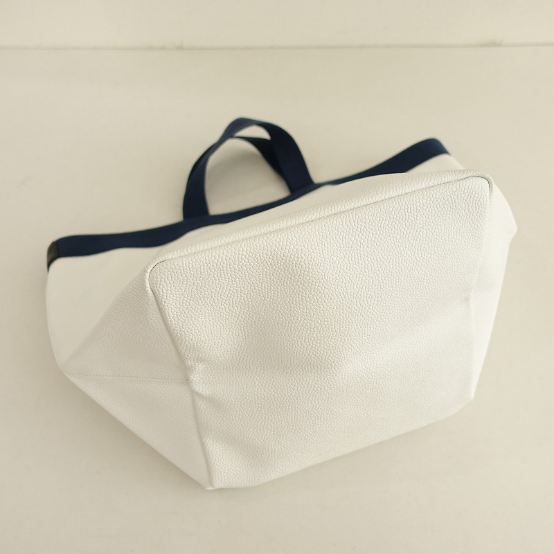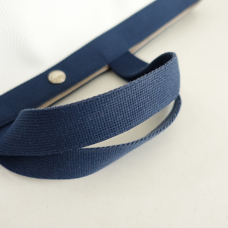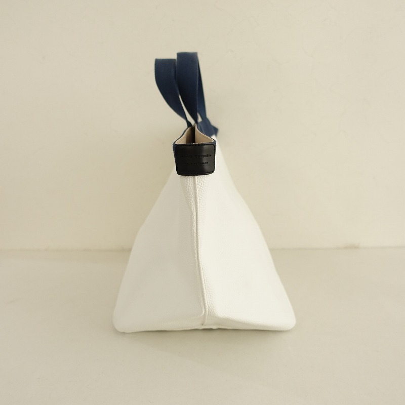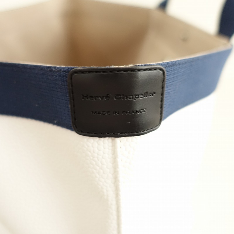 | Herve Chapelierの舟形トートバッグです。カラーはホワイトレザー×ネイビーで、開口はスナップボタン留めです。サイドには縫い留められたロゴ入りレザーがあしらわれ、上に大きく広がるシルエットで荷物を出し入れしやすく、底マチが広く作られているので収納力がございます。内側にオープンポケットが1個付きです。 |