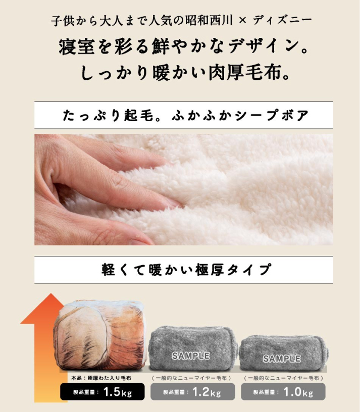 2.中綿入り毛布は、軽くて暖かい極厚タイプ。