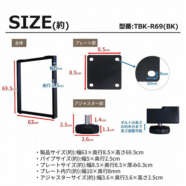 2025年2月モデルチェンジ、高さが従来品と異なります。【特徴】こちらはテーブル脚のみとなります。取り付けのネジ等は付属しておりません。テーブルキッツのシリーズはテーブル天板とテーブル脚の組み合わせをお選びいただけます。テーブルキッツ用の脚、高さ69.5cmです。艶消しブラック色ですテーブル天板を取り付けるネジは付属しておりませんが、用途に応じてお選びいただけます。(別途郵送)テーブルでの使用の際の寸法は、テーブルの厚みを脚の高さに足してください。 【注意点】こちらに合うシリーズの天板は奥行65・75cmです。屋内用です。屋内用です。濡れた場合はすぐに拭かれるよう、お願いいたします。【井崎店長レビュー】アジャスターが予めセットされております。お客様のご用意されますテーブル天板との取り付けの場合、別途木ネジなどが必要となります。(詳細はお持ちのテーブル天板製造元にご確認ください。)【本体外寸】レーム脚部分の形状は長方形5×2.5×奥行63×高さ69.5cm(アジャスター含む)(約)※テーブル天板との取り付け部分は正方形1辺8.5cmです。ご使用時の高さは、テーブル厚みと脚を合計したものとなります。【色・主材】艶消しブラック色・スチール【生産国 】CHINA●送料無料:(沖縄・離島/別途お見積もり)家具は重量がありますので、配達中などのアクシデントがゼロではありません。その場合は迅速に交換いたします。