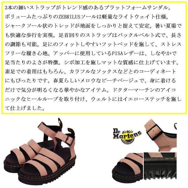 | スペック | シャークソール状のトレッドが地面をしっかりと捉えて安定。足首回りのストラップはバックルベルト式で、長さの調節も可能。足にのフィットしやすいフットベッドを施して、ストレスフリーな履き心地。アッパーに使用しているPISAレザーは、しなやかで足当たりのよさが特徴。シボ加工を施しマットな質感に。素足での着用はもちろん、カラフルなソックスなどとのコーディネートにもぴったりです。春夏らしいメロウなピーチベージュで、身に着けるだけで気分が明るくなる華やかなアイテム。ドクターマーチンのアイコニックなヒールループを取り付け、ウェルトにはイエローステッチ仕上げ。 |