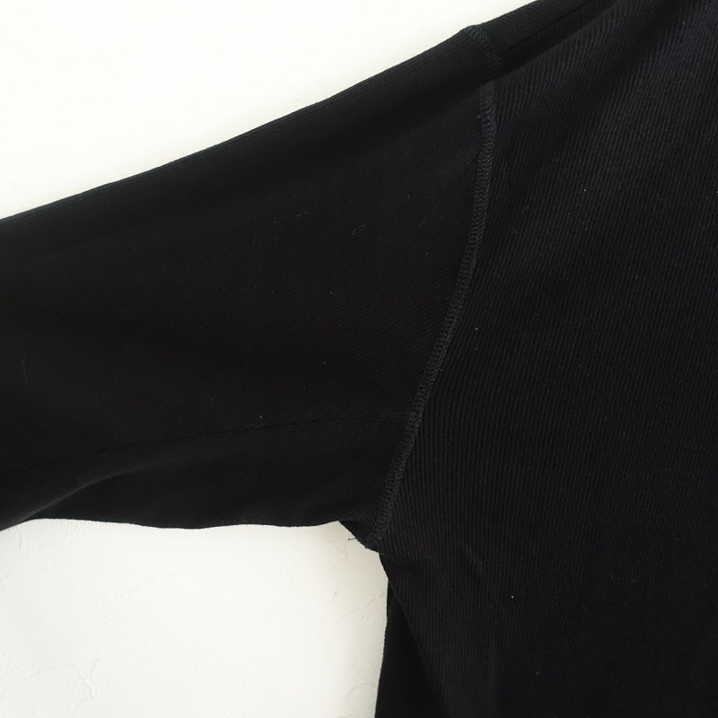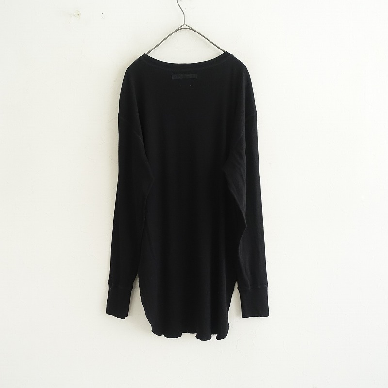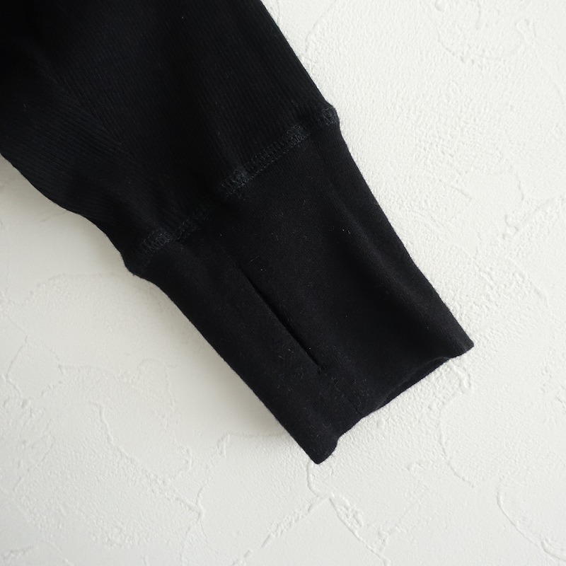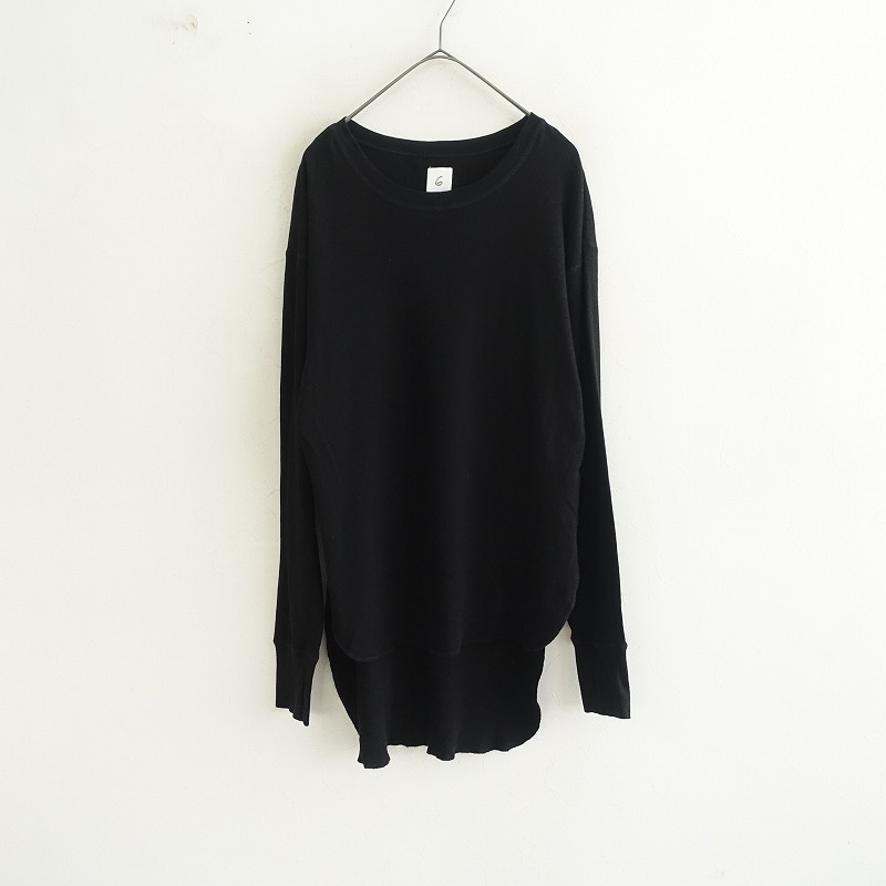 6の綿ウールテレコ前後差サムホールプルオーバーです。カラーはブラックです。薄手で柔らかく、伸縮性に富んだコットンとウールのテレコ素材を使用。少し肩が落ちたドロップショルダーで、後ろ裾が長いテールカット。袖は手の甲までカバーするフィンガーホール付き。裾はロックミシン始末です。定価(メーカー希望小売価格)17,600円の商品です。 |