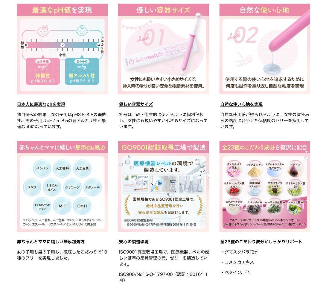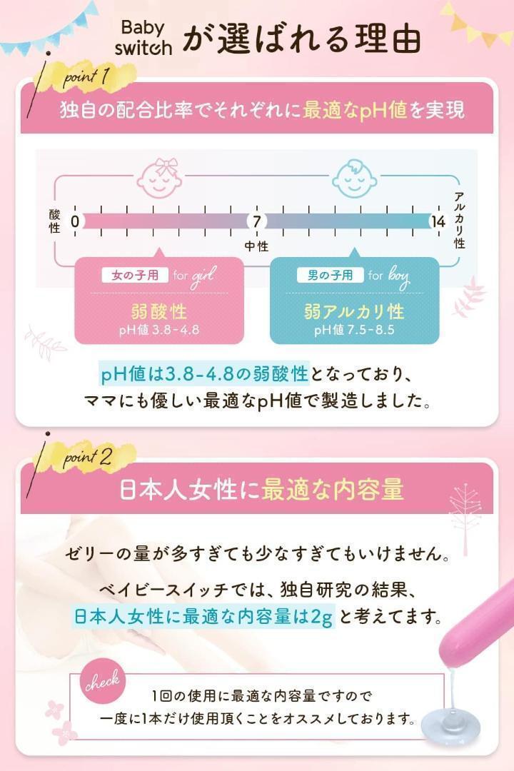 【日本人に最適化したpH値】独自研究の結果、ママになるための理想的な環境をサポートするために、女の子用はpH3.8~4.8の弱酸性、男の子用はpH7.5~8.5の弱アルカリ性と最適なpH値になっています。また、ゼリーの内容量も日本人向けに調整し、日本人女性にとって最適な量である2gに調整しています。