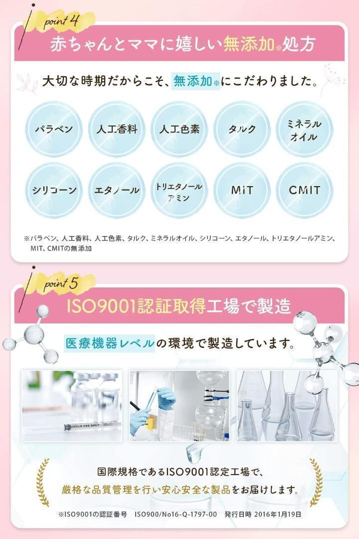 【こだわりの天然成分】主に天然の成分を使用することで、ママへの負担を少しでも抑えられるように配慮しています。さらに、10種類のフリー化を実現。カラダに負担になる成分を使用していないことも支持されている理由です。