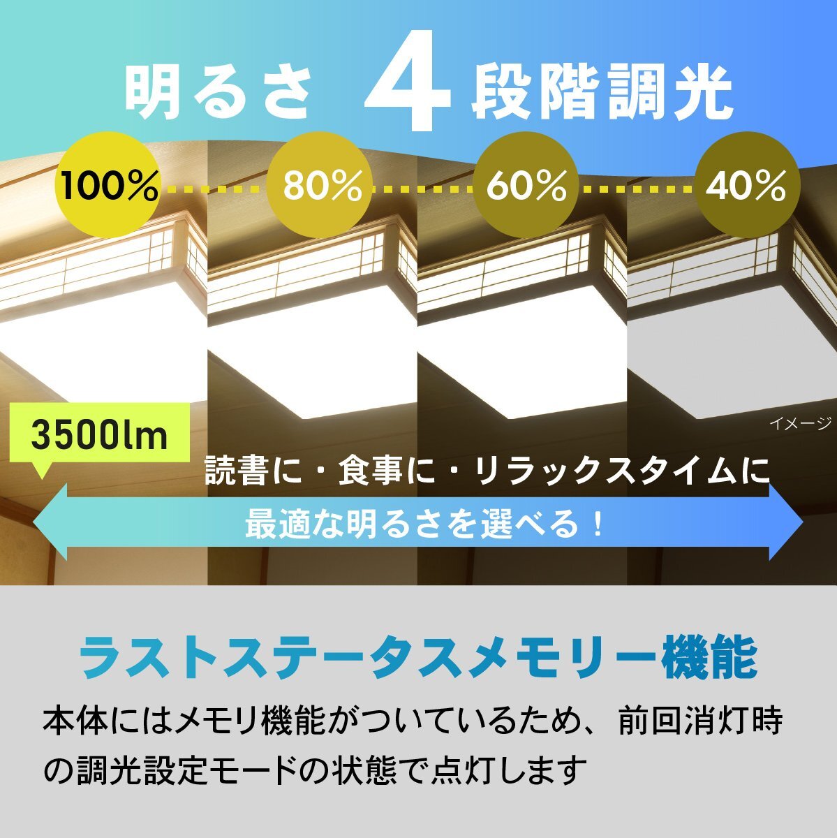 ■ 全光束:8畳用(100%)点灯時…3500 lm、6畳用(80%)点灯時…2900 lm、4.5畳用(60%)点灯時…2200 lm、40%点灯時…1500 lm