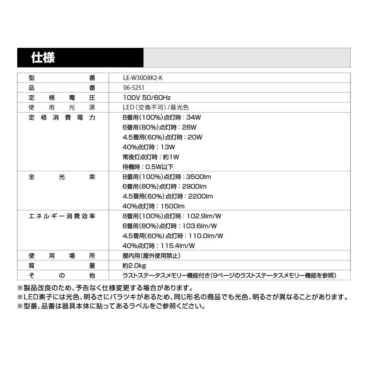 ■ エネルギー消費効率:8畳用(100%)点灯時…102.9 lm/W、6畳用(80%)点灯時…103.6 lm/W、4.5畳用(60%)点灯時…110.0 lm/W、40%点灯時…115.4 lm/W