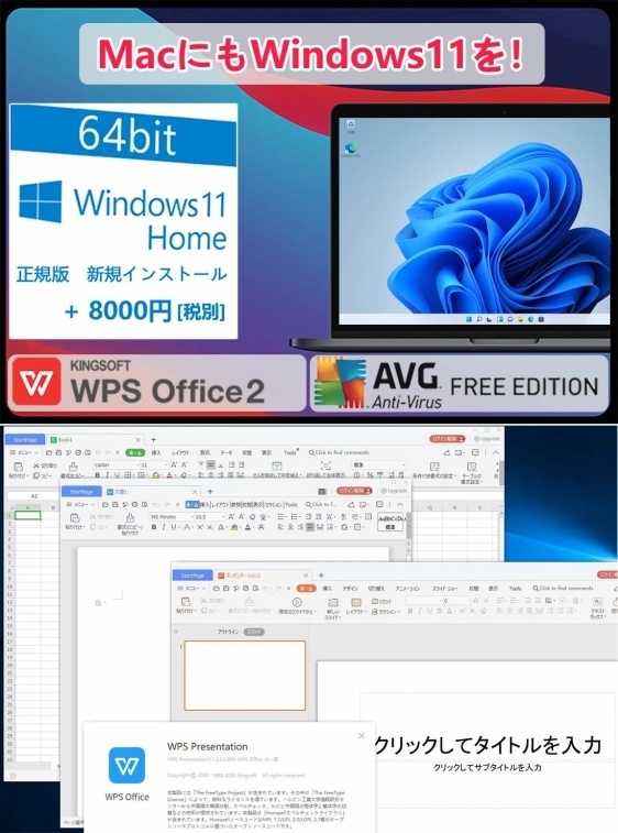| オプション | ※追加 8000円 [税別]で、正規版Windows 11 Home 64bit(もしくはWindows10 Home 64bit)を追加インストールできます。(BootCamp方式、正規プロダクトシール付属、パーティション区画容量指定、OSバージョン指定可能。 ※追加インストールの場合、Windowsに標準搭載 Kingsoft WPS Office2 製品版の永続版ライセンスカード付、(Word/ Excel/ Powerpointのファイルと互換可能)) 追加 3000円 [税別]でKingsoft Office 製品版for MacOSの永続版 ライセンスカード付 (通常販売価格:7800円)(Word/ Excel/ Powerpointのファイルと互換可能)