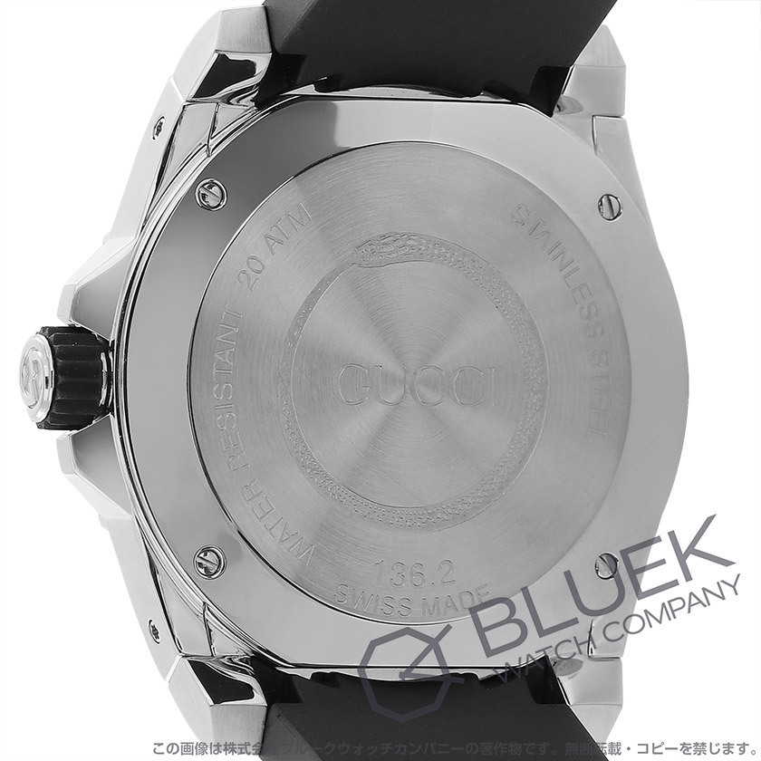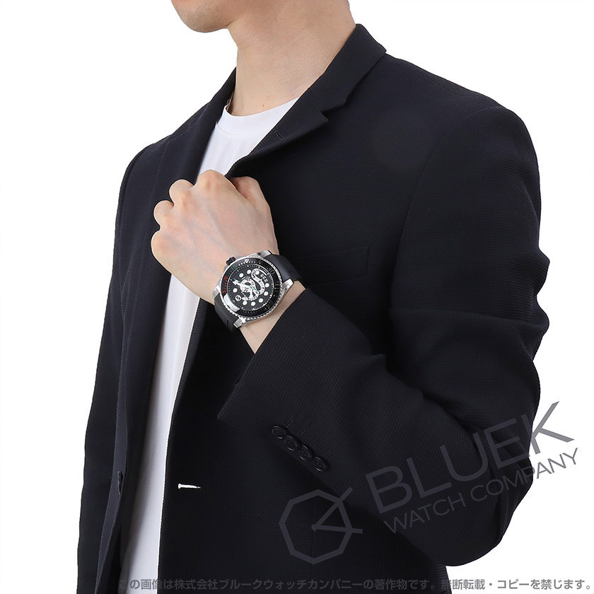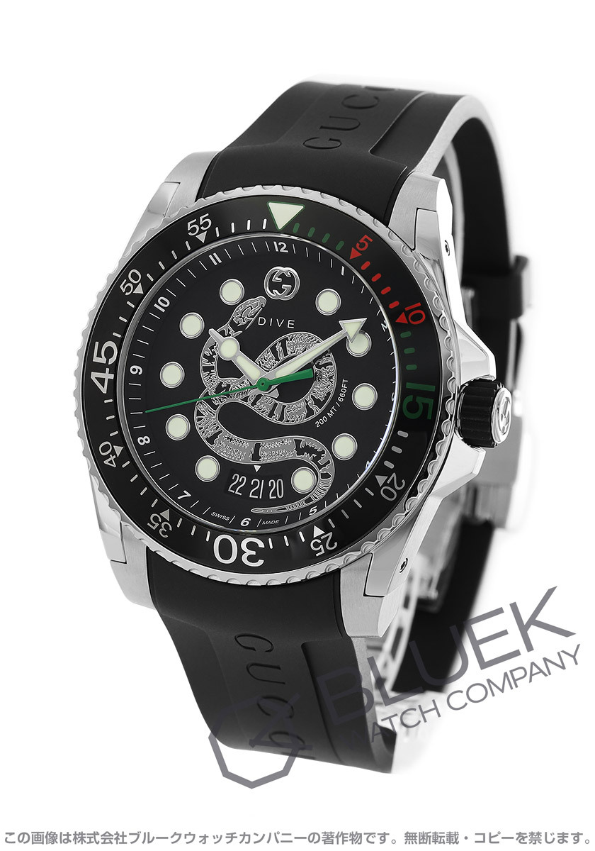 | ブラックフェイスの逆回転防止ベゼルにグッチのシグネチャーカラーレッド×グリーンをあしらい、ダイヤルにグッチを象徴するモチーフの一つシルバースネークを配したダイヴクオーツは、大ぶりサイズも男らしい厚さ12ミリの45ミリ200m防水ケースにブラックラバーベルトを合わせたグッチ人気のタイムピース。ワイドな6時の窓に日付を表示し、シルバー指針とドットインデックスには蛍光塗料が塗布されて暗所でも視認性を発揮します。中でも2019年にクルーズコレクションとして誕生したこのモデルは、Dバックルも魅力。タフなつくりも使い勝手に優れ、ダイナミックでスポーティなデザインが男性の腕で抜群のインパクトを放ちます。 |