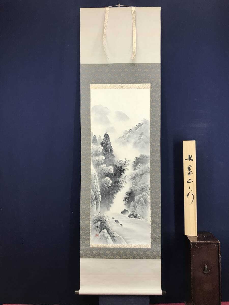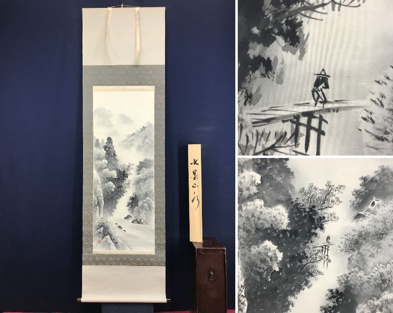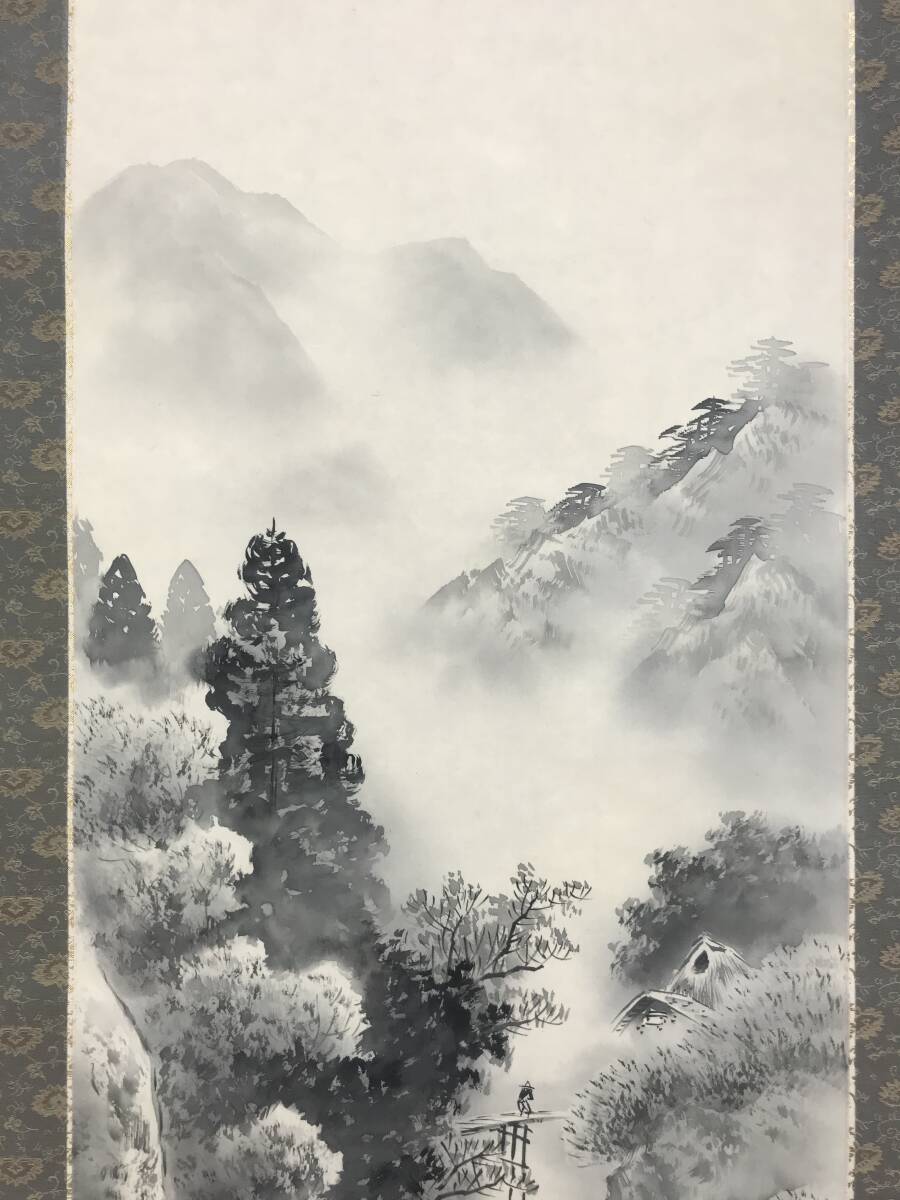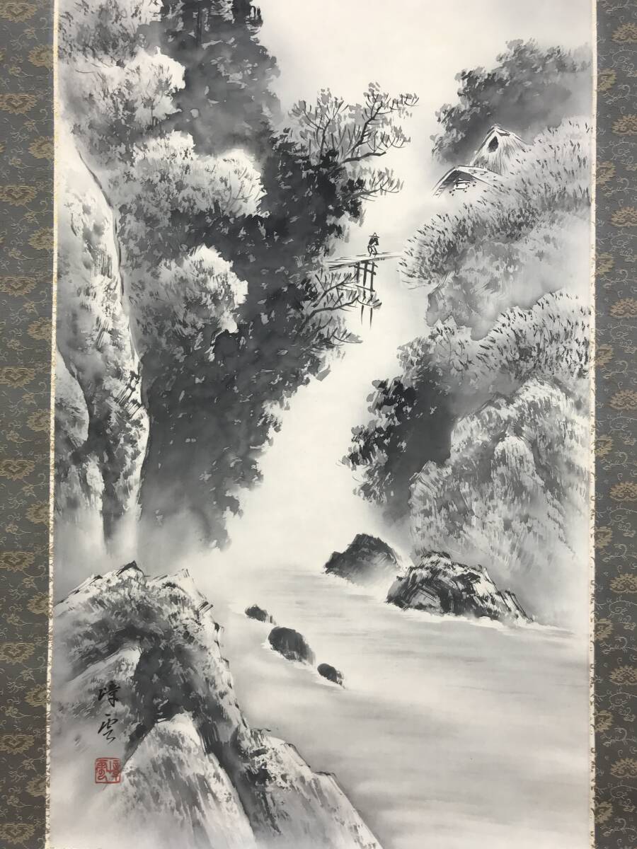 真作/名和嶂雲/水墨山水図/山水人物図/掛軸☆宝船☆AJ-269