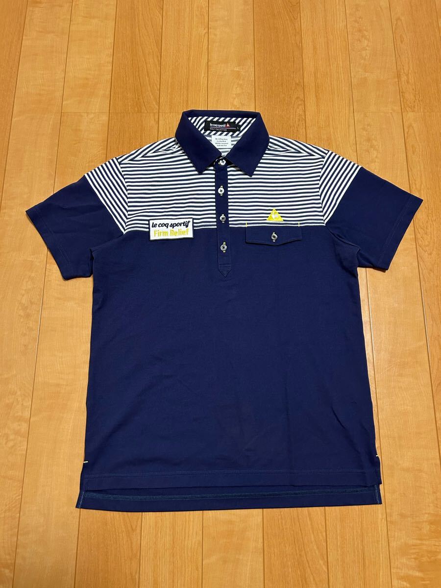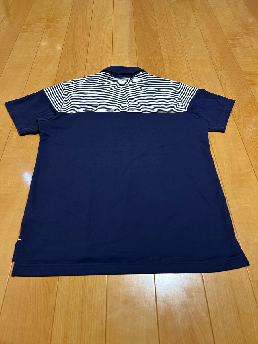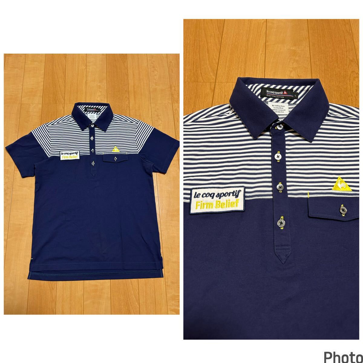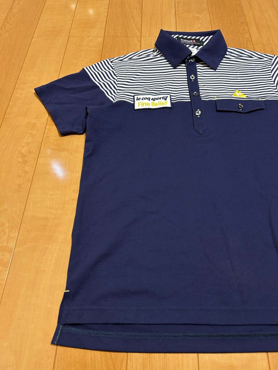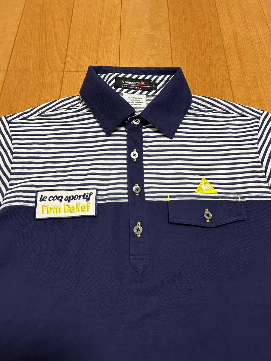 良品☆ルコック.ゴルフコレクション L 速乾性生地.半袖ポロシャツ ワッペン&刺繍ロゴ付・マリンボーダー柄切替&ポケット付 デサント社製
