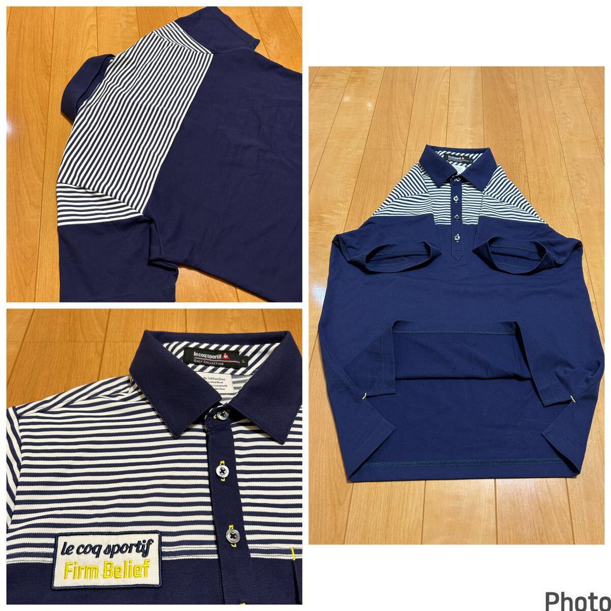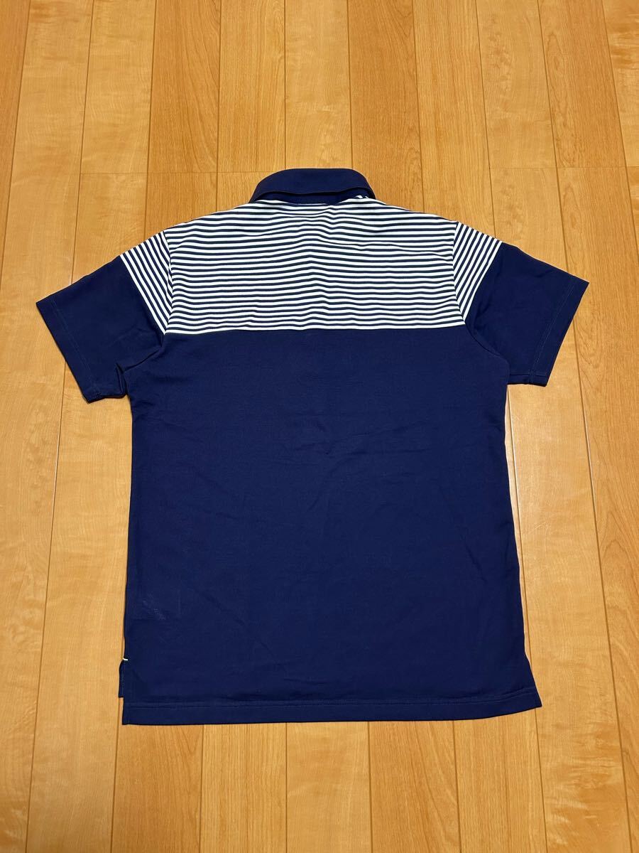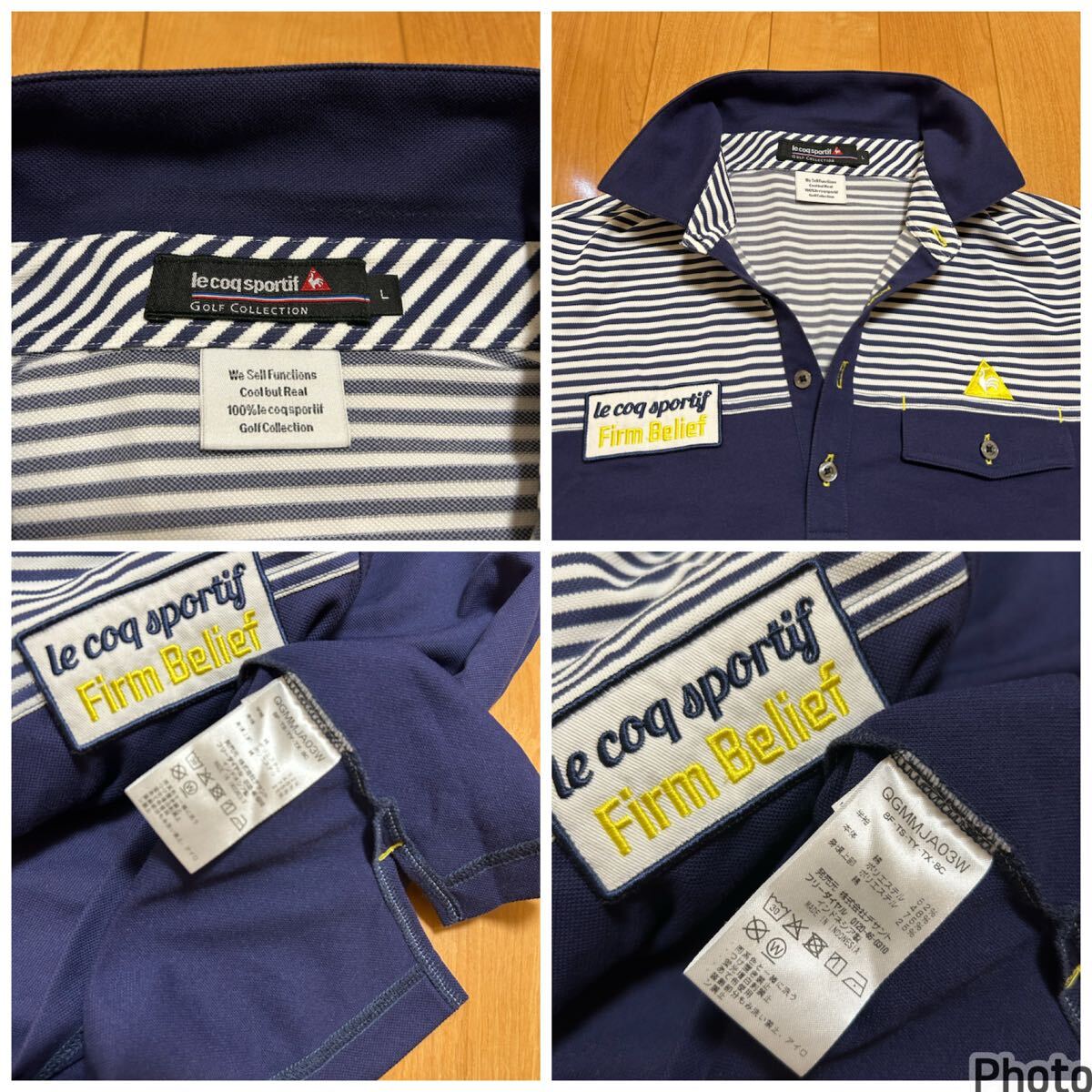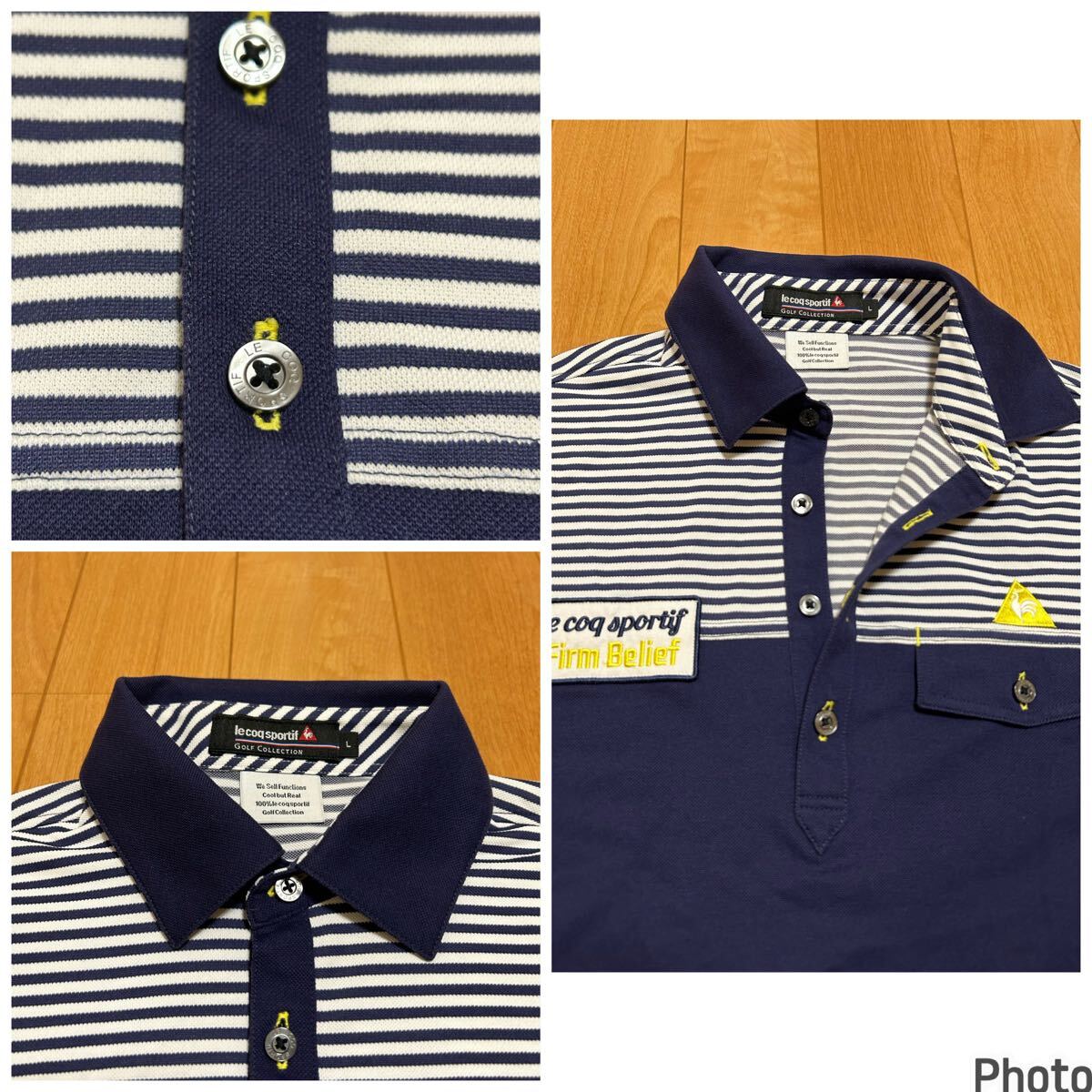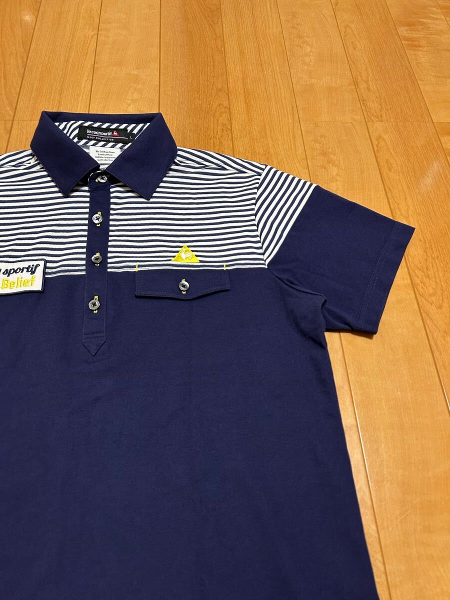 良品☆ルコック.ゴルフコレクション L 速乾性生地.半袖ポロシャツ ワッペン&刺繍ロゴ付・マリンボーダー柄切替&ポケット付 デサント社製