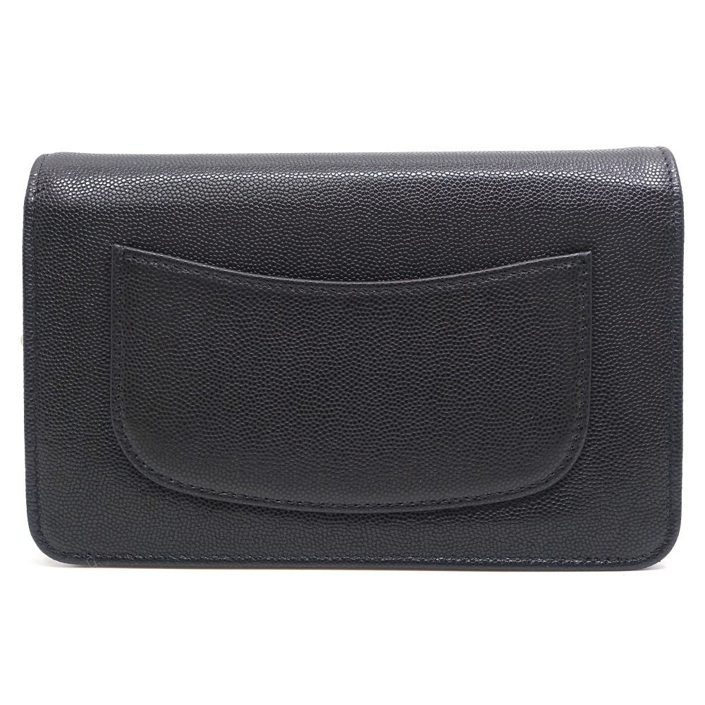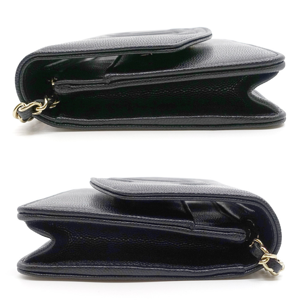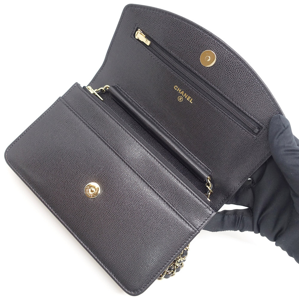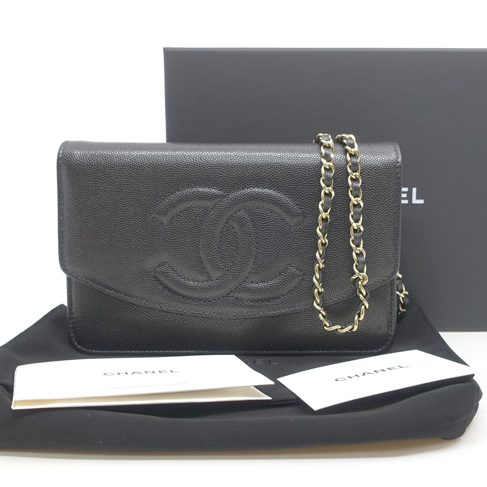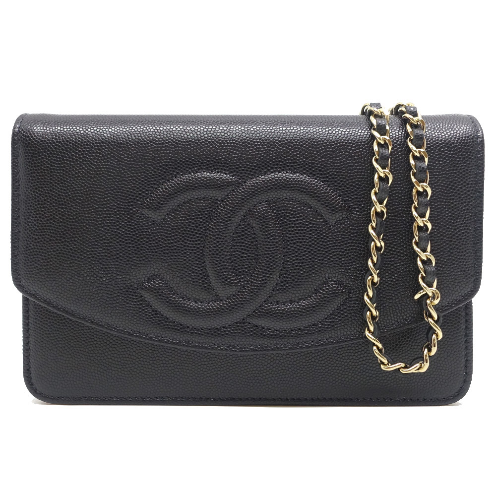 【栄】シャネル チェーンウォレット ココマーク ランダムシリアル キャビアスキン ブラック ゴールド金具 財布 女性 箱 保存袋