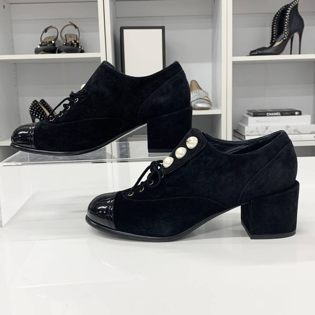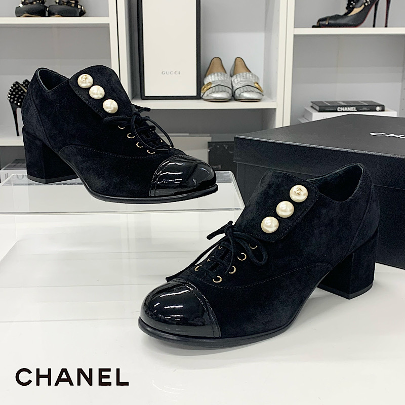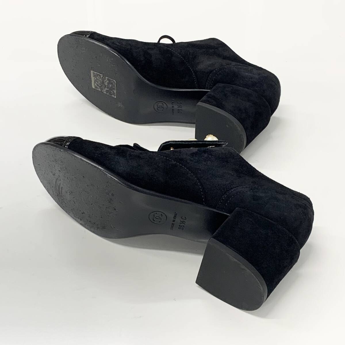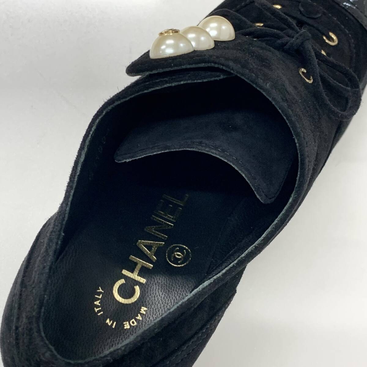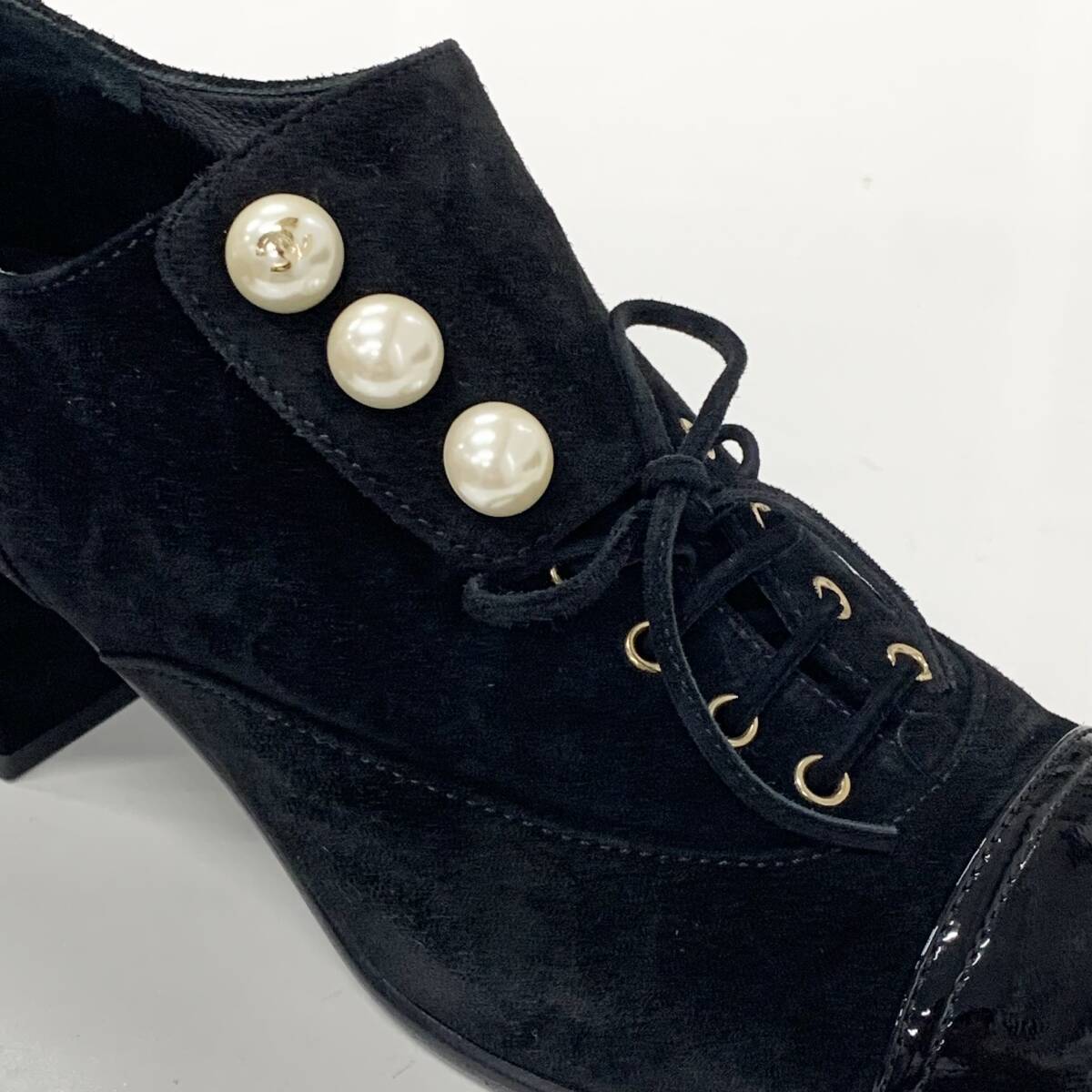 シャネル スエード パテント パール ココマーク レースアップシューズ ブラック