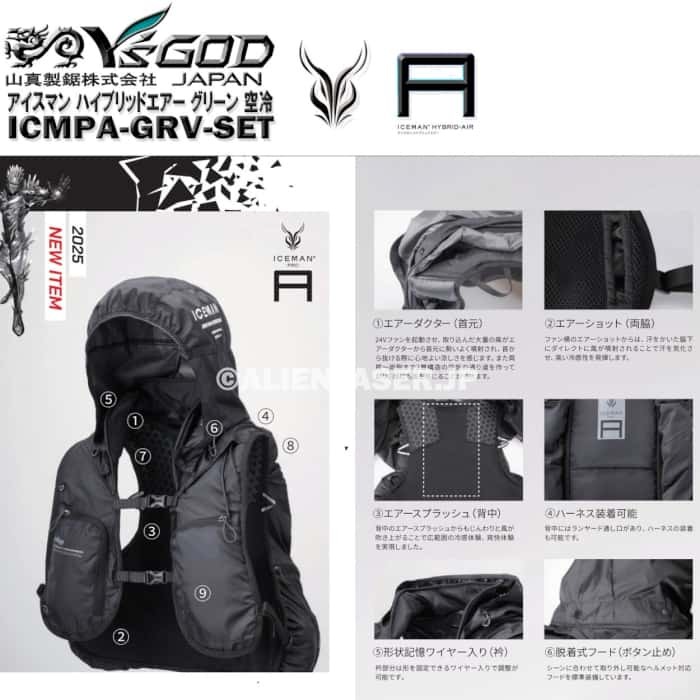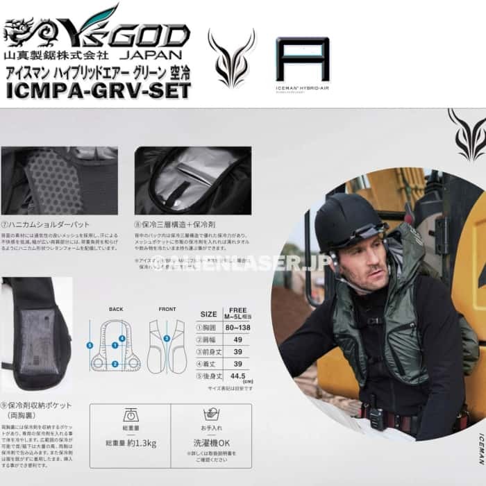「アイスマン ハイブリッドエアー(プロではありません)」空冷ベスト※水冷ではありません!サイズ目安。FREEサイズM-5L相当。バッテリー使用時間3-11.5時間。重量約1.3kg。お手入れ洗濯機OK※詳しくは取扱説明書確認。付属品。アイスマンAR24Vファン×2 アイスマンAR24Vバッテリー×1 アイスエアー×2 ファンケーブル×1 ACアダプター×1 充電ケーブル×1 取扱説明書×1 ※スマホ供給用のケーブルは付属していません。アイスジー※モニターの発色具合により、実際のものと色が異なる場合がございます。