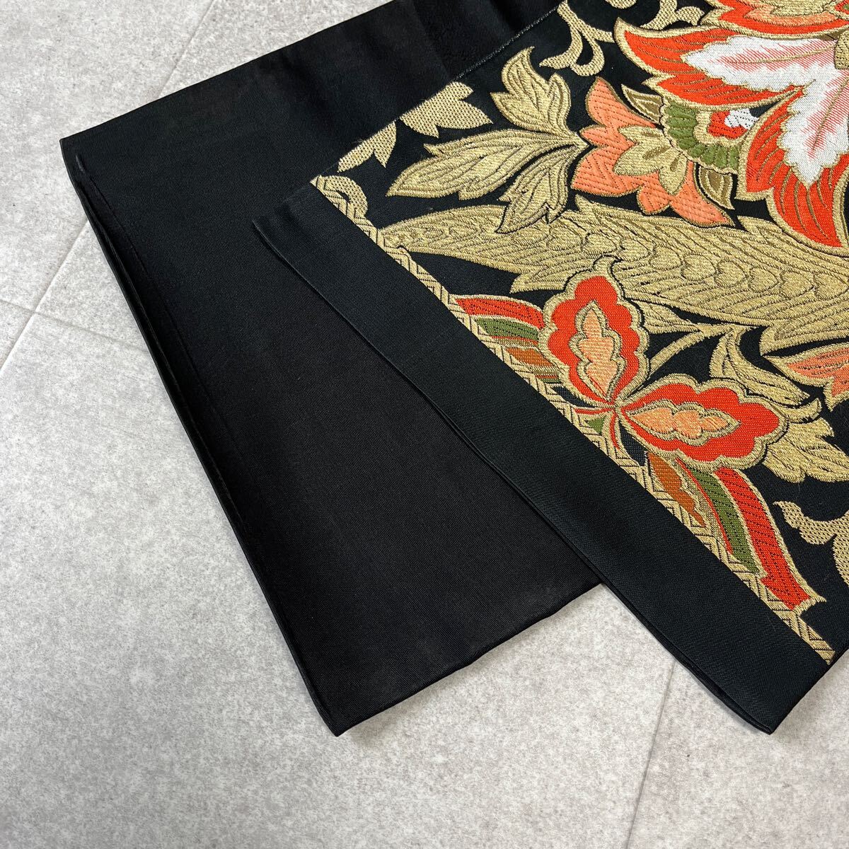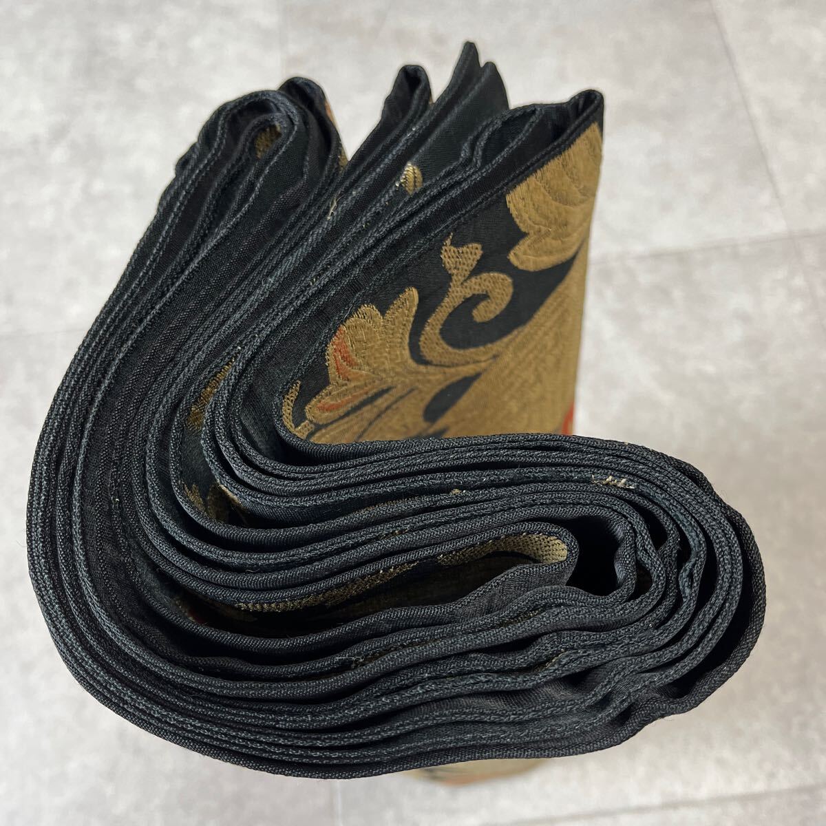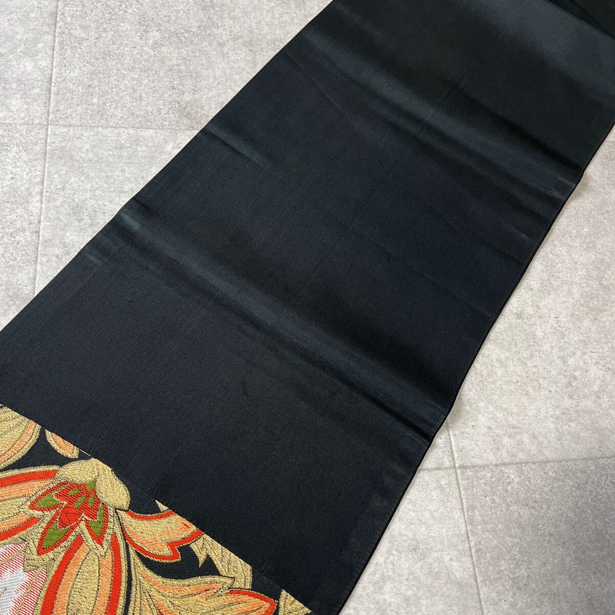 アンティーク 袋帯 孔雀の羽 洋花 金糸 黒地 大人シック 着物 大正ロマン モダン 和洋折衷コーデ か10-03y 大正ロマン