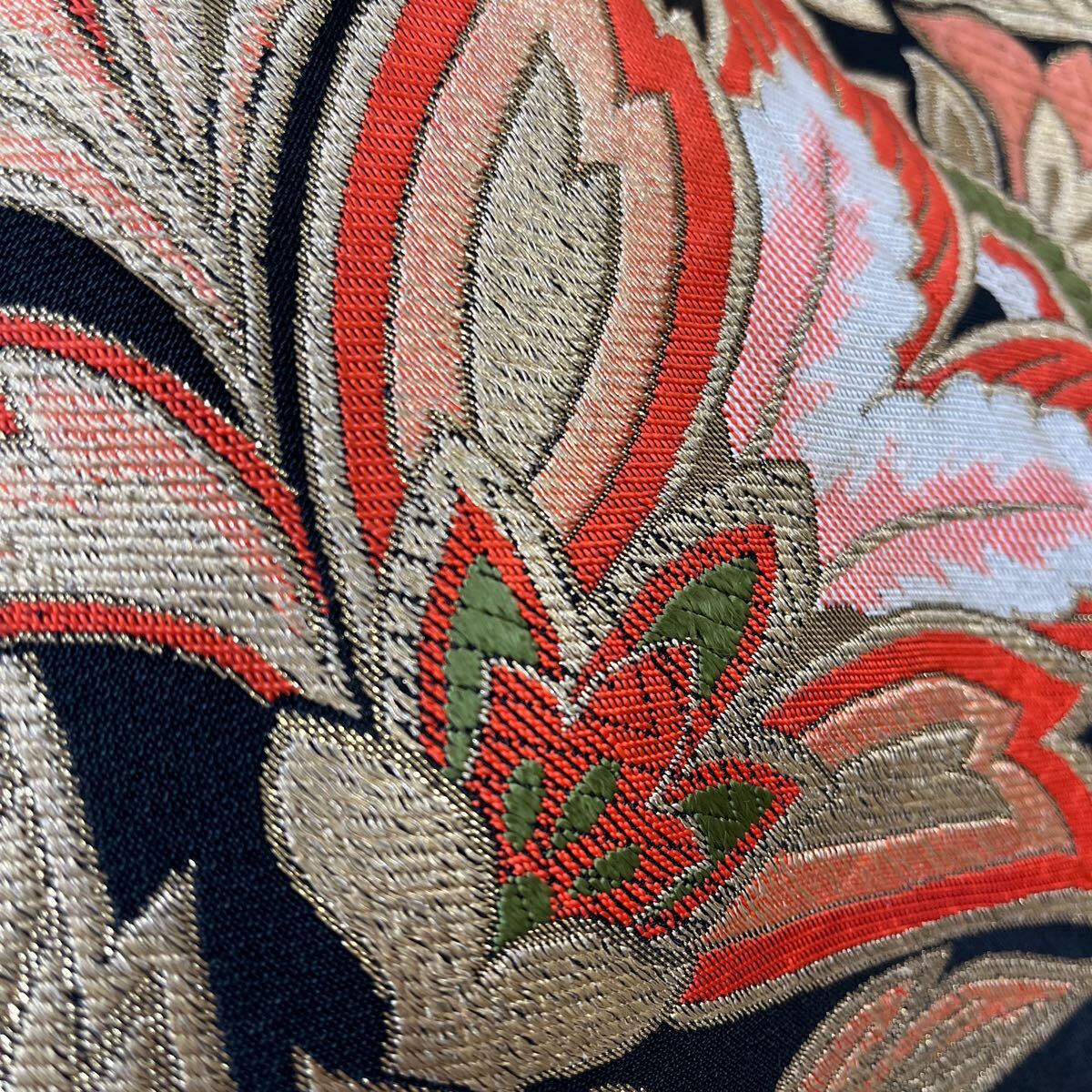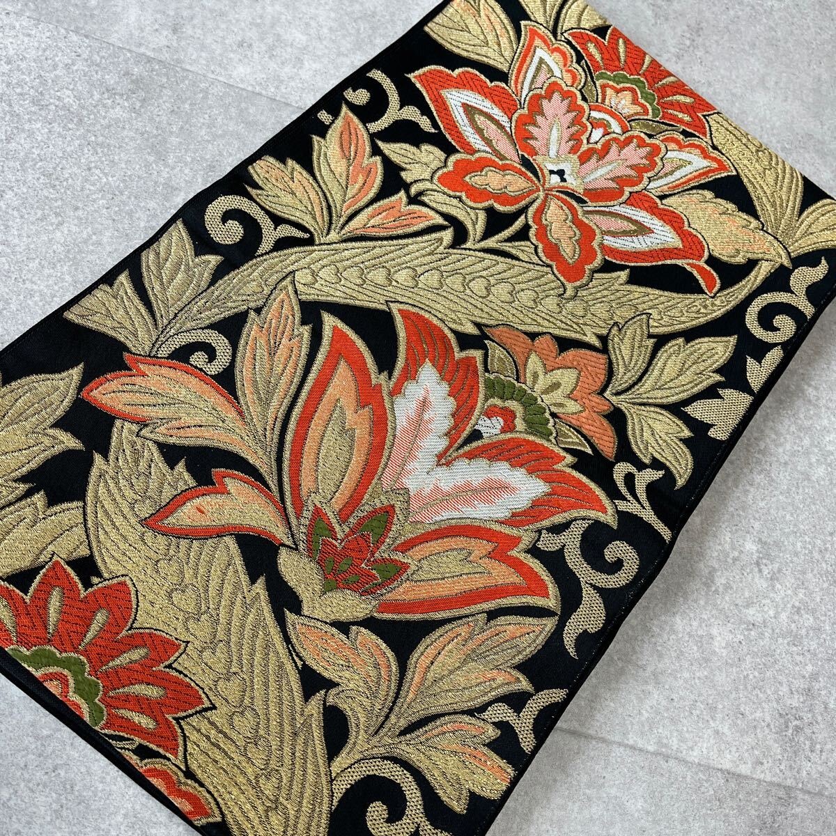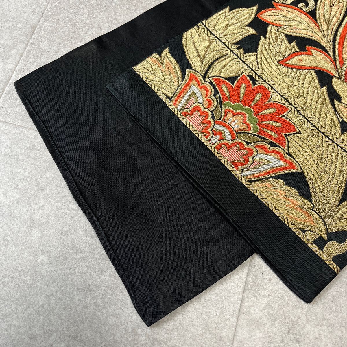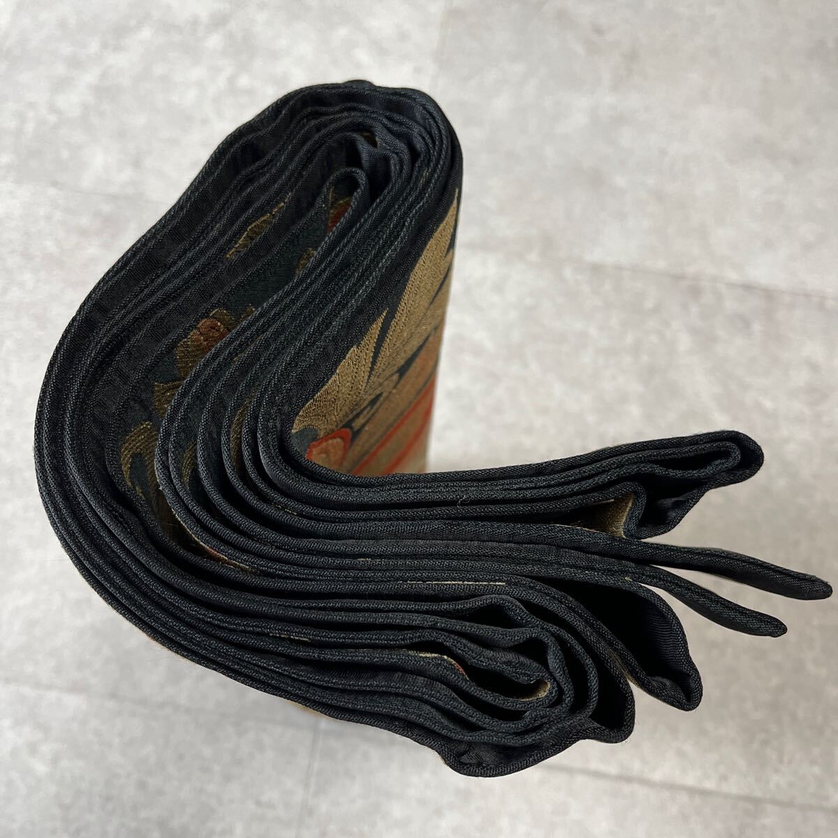 アンティーク 袋帯 孔雀の羽 洋花 金糸 黒地 大人シック 着物 大正ロマン モダン 和洋折衷コーデ か10-03y 大正ロマン