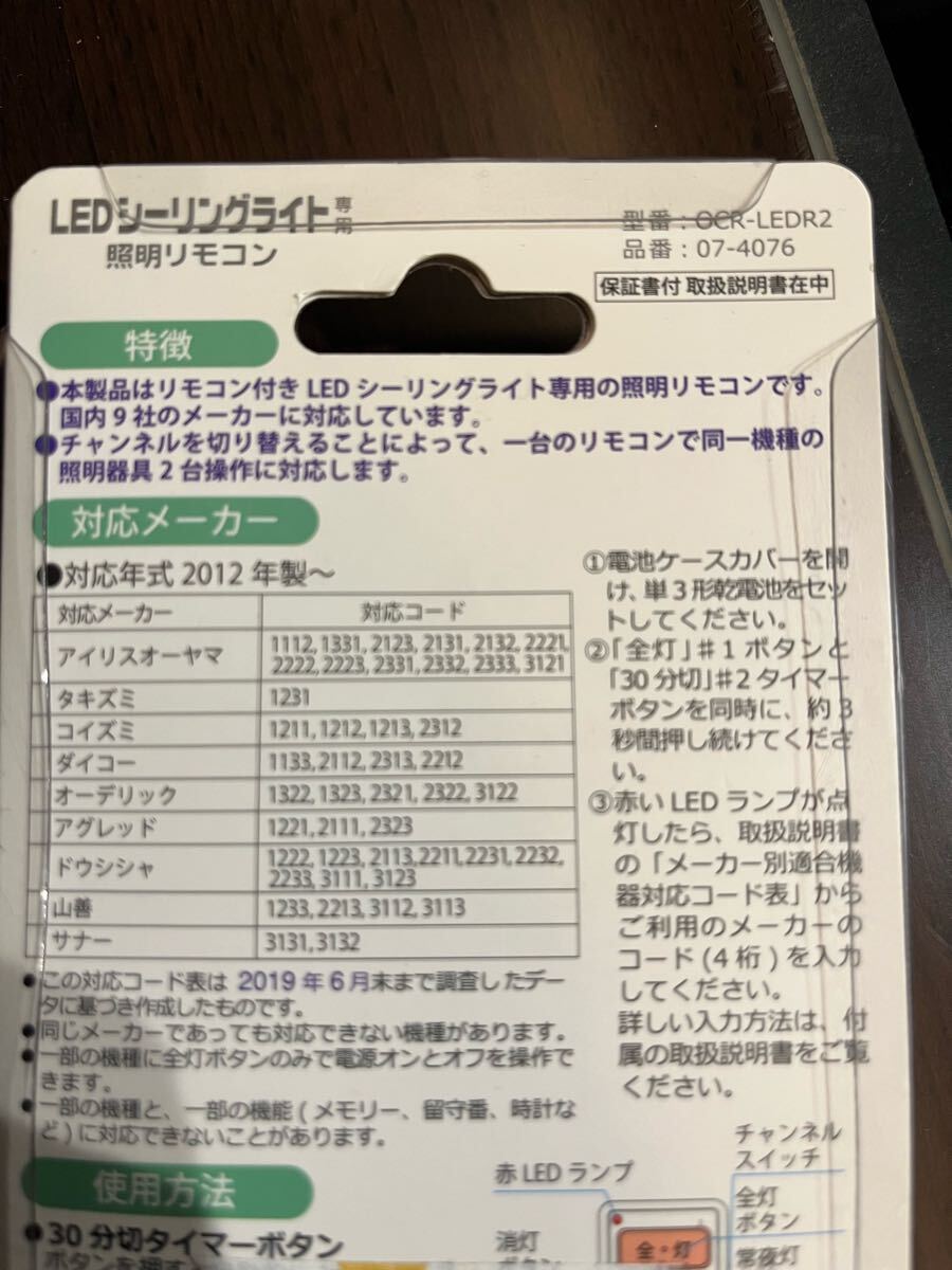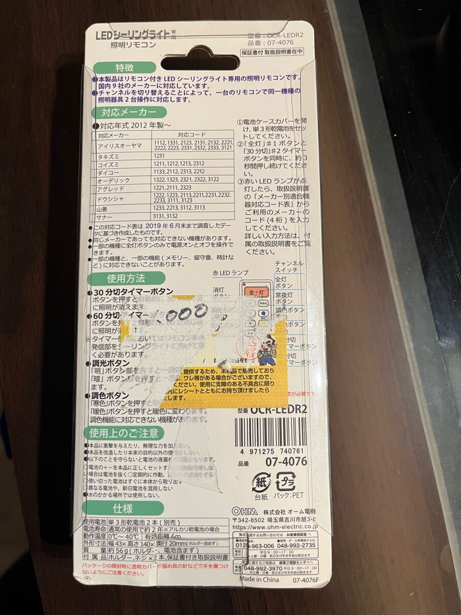 オーム電機製のLEDシーリング用リモコンOCR-LED R2です。
