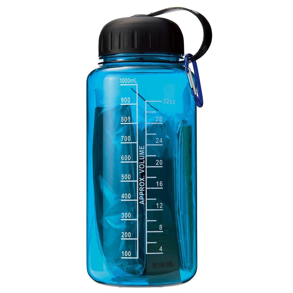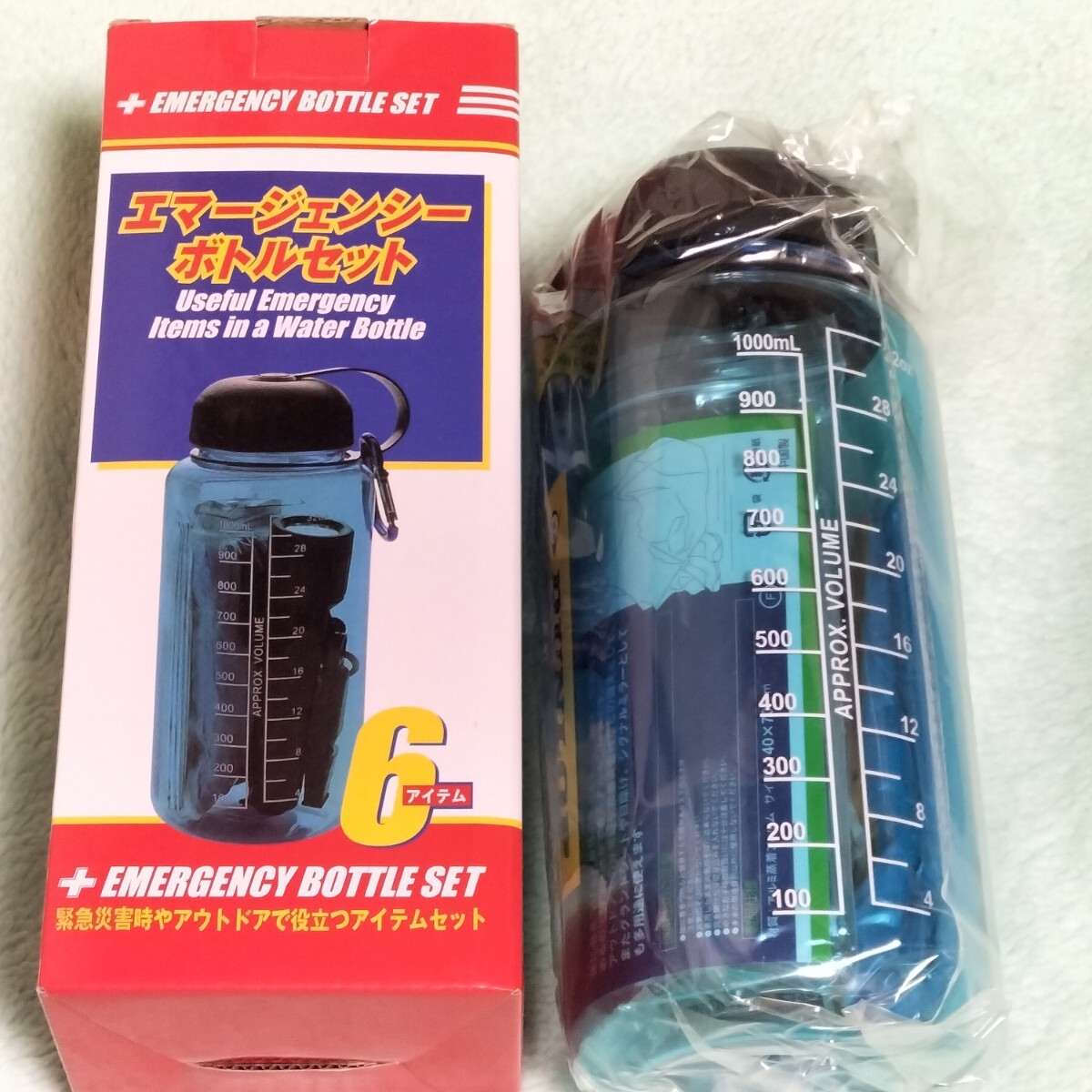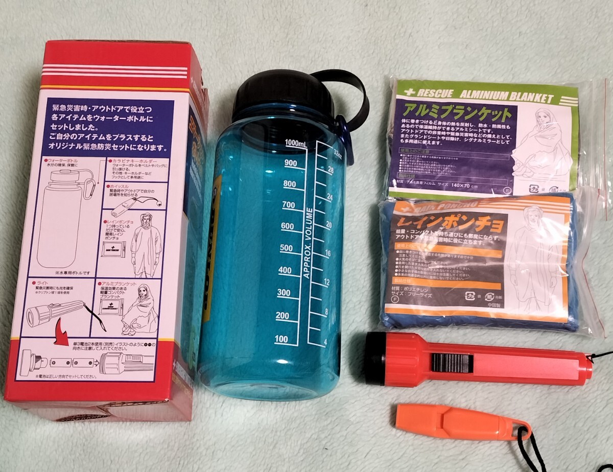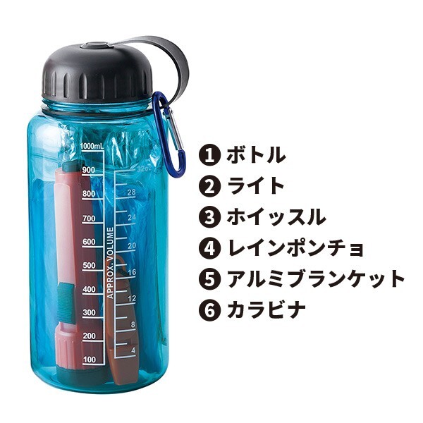 ウォーターボトル×1・カラビナキーホルダー×1・アルミブランケット×1・ホイッスル×1ハンディライト×1・レインポンチョ×1