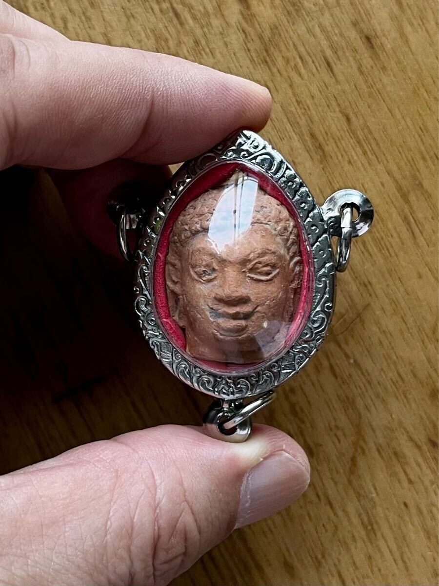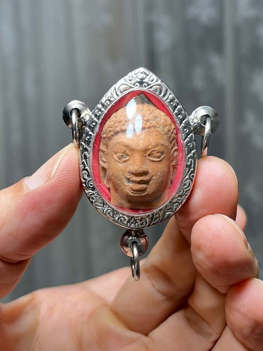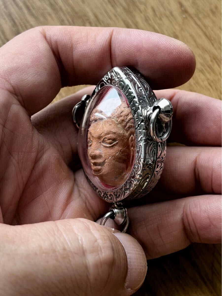 ・100%本物です。タイ ドヴァーラヴァティー期 テラコッタ製人物像の頭部残欠です。タイ中部ナコンサワン県チャンセンで出土したもので年代は7〜9世紀のものです。タイ初期のドヴァーラヴァティー美術様式の顔つきで口元はアルカイックスマイルに近い笑みを浮かべており、いい表情をしています。同型の頭部がナコンサワン県チャンセン博物館、ロッブリー県ナーラーイ国立博物館、スパンブリー県ウートン国立博物館等で展示されています。写真1〜7枚目は日中、8〜10枚目は夜間照明下で撮影した写真です。ちょうどいいお守り用ケースに入れておきました。ブログ「タイ骨董日記」でも2025年5月25日に記事にしています。博物館の同型の写真も掲載していますので是非ご覧下さい。