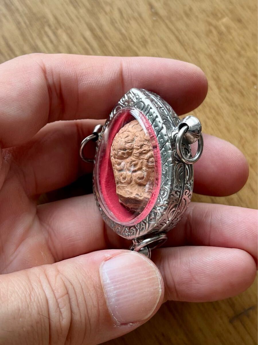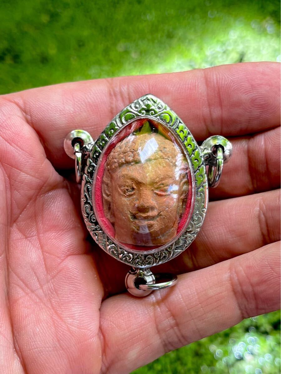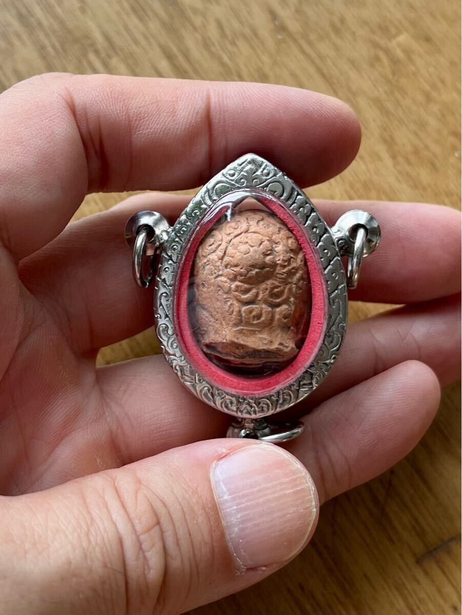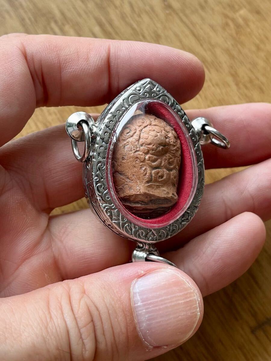 ・100%本物です。タイ ドヴァーラヴァティー期 テラコッタ製人物像の頭部残欠です。タイ中部ナコンサワン県チャンセンで出土したもので年代は7〜9世紀のものです。タイ初期のドヴァーラヴァティー美術様式の顔つきで口元はアルカイックスマイルに近い笑みを浮かべており、いい表情をしています。同型の頭部がナコンサワン県チャンセン博物館、ロッブリー県ナーラーイ国立博物館、スパンブリー県ウートン国立博物館等で展示されています。写真1〜7枚目は日中、8〜10枚目は夜間照明下で撮影した写真です。ちょうどいいお守り用ケースに入れておきました。ブログ「タイ骨董日記」でも2025年5月25日に記事にしています。博物館の同型の写真も掲載していますので是非ご覧下さい。