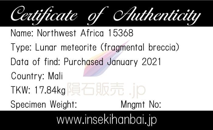 正式な隕石名はNorthwest Africa 15368です。2021年1月にマリ共和国でラクダと羊を飼っている者により総質量17.84 kgの塊が発見され、その後にAhmed Salek氏が購入し米国の匿名コレクターに販売されました。2022年12月現在、米国の匿名コレクターが主塊を保有しており、NWA15368は別名アルテミス17と呼ばれています。黒っぽい外観で部分的にカリーチに覆われており切断面からはガラス質の暗灰色の中に断片的な角礫岩が見えます。