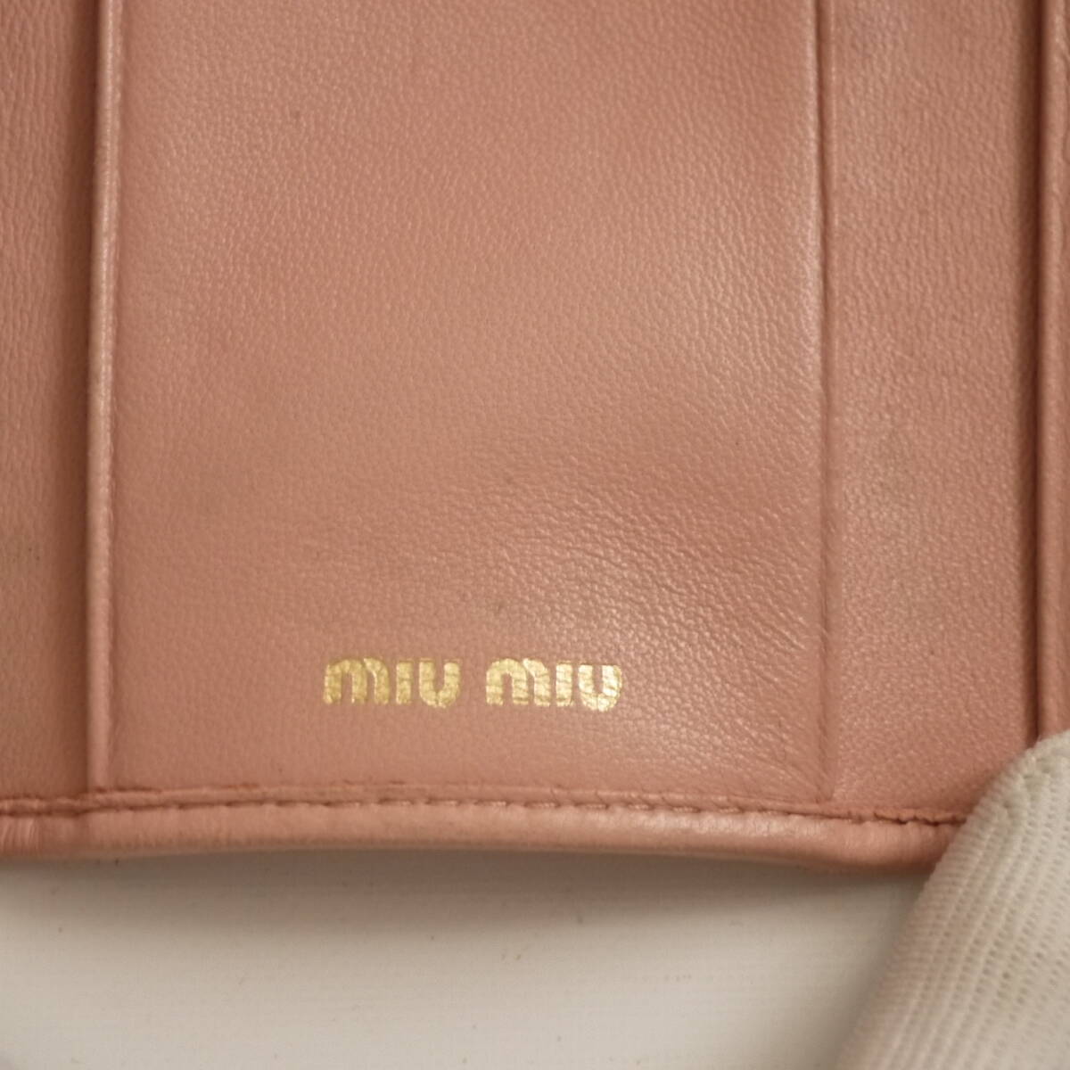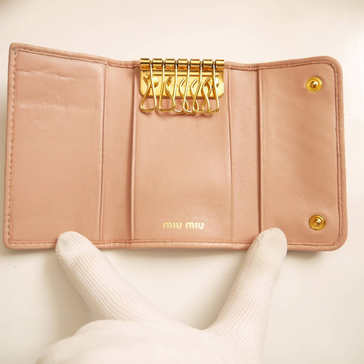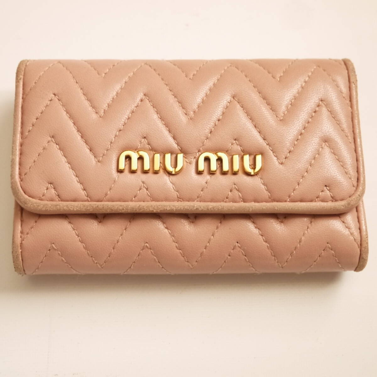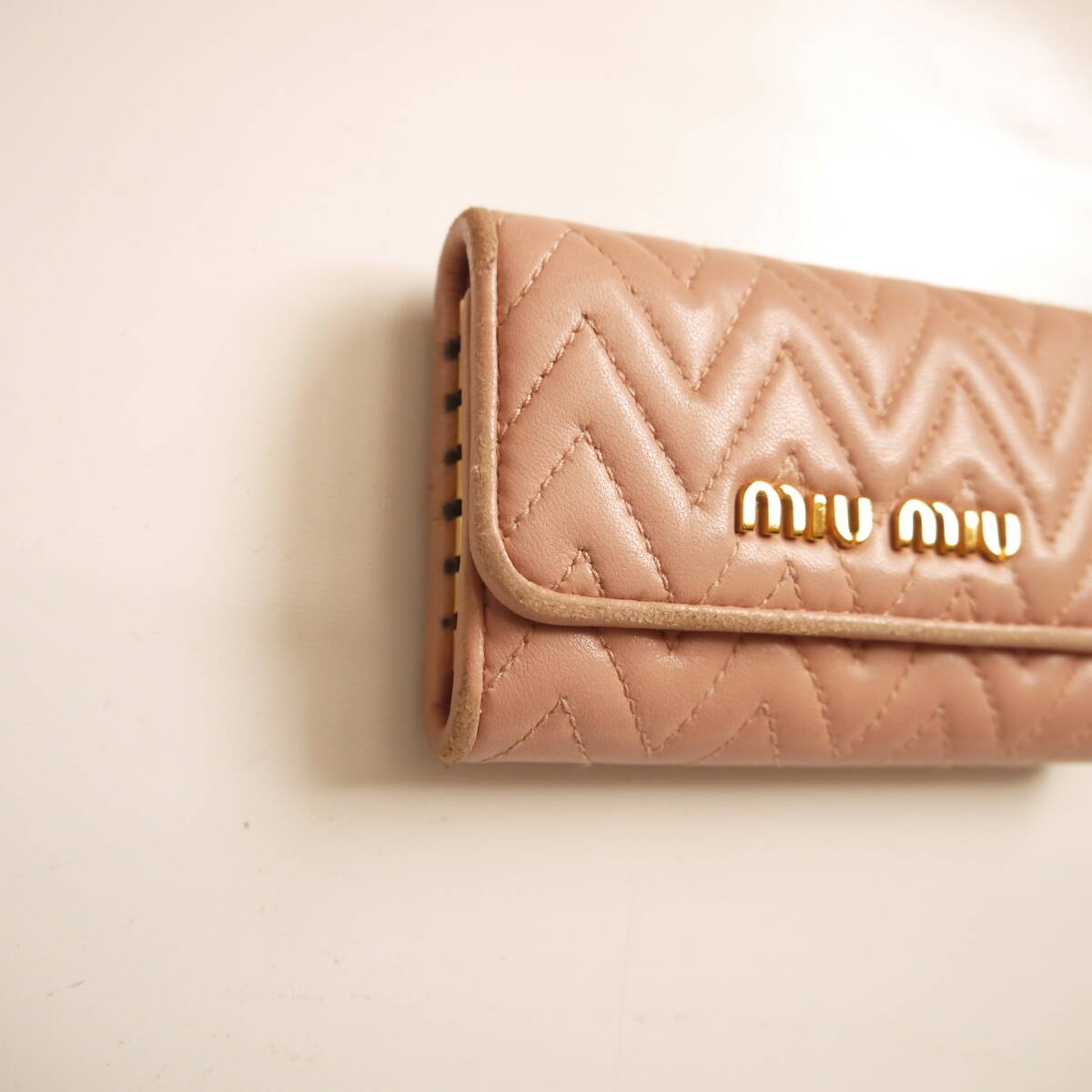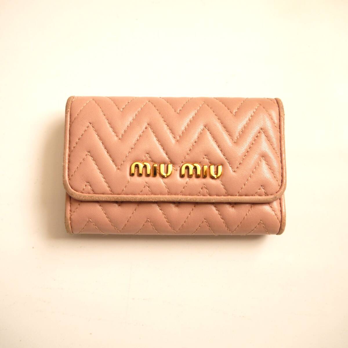 ◇  希少カラー!  コンパクトで 上品な♪              ミュウミュウ の  さくら色 ピンク系   ギャザー レザー素材の  立体感のある♪ マテラッセ デザインに    miumiu の ぴかぴか ゴールドロゴが お洒落な♪     イタリア製  本革 レザー素材 ・ 6連 キーケース に成ります。