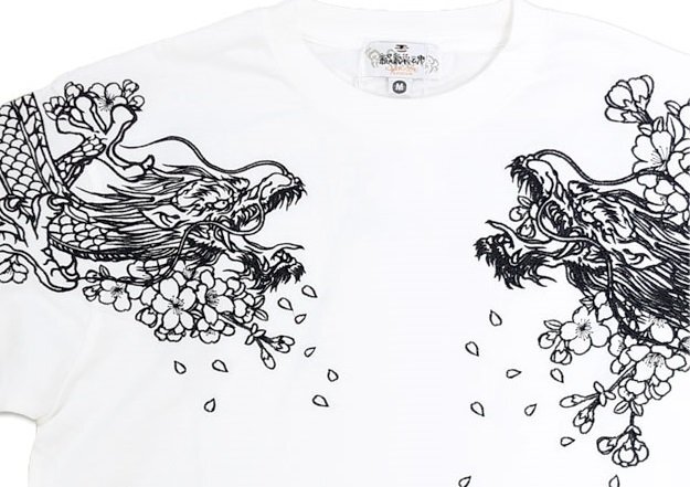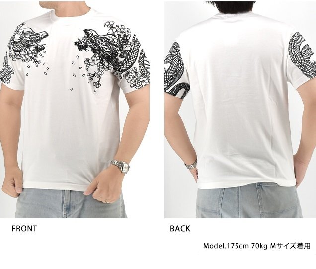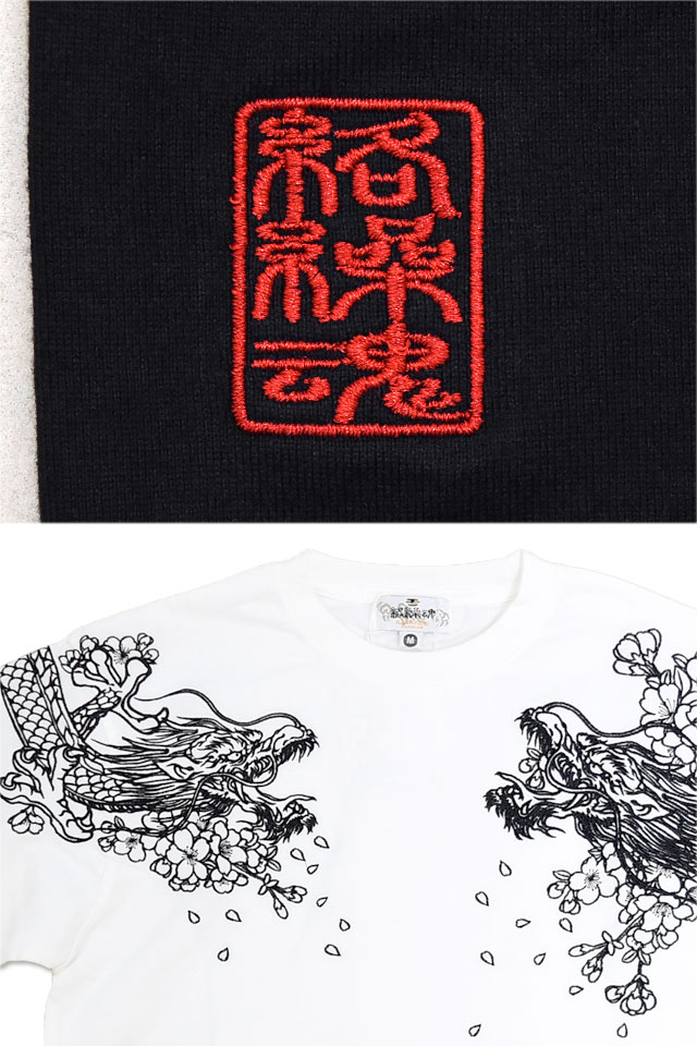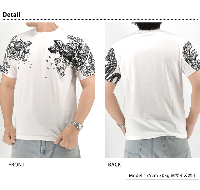 絡繰魂さんから「双龍半袖Tシャツ(252045)」のご紹介です。 両肩にそれぞれ龍を落とし込んだ、双龍柄の半袖Tシャツです。 アウトラインのみで表現されており、実際に着用した際には、体のラインに沿って柄がより立体的に浮かび上がります。 裾にはブランドロゴを印風に表現しました。 ボディーには、刺繍に負けないコシのある綿100%の生地を使用しています。 | |||||||||||||||||||||||||