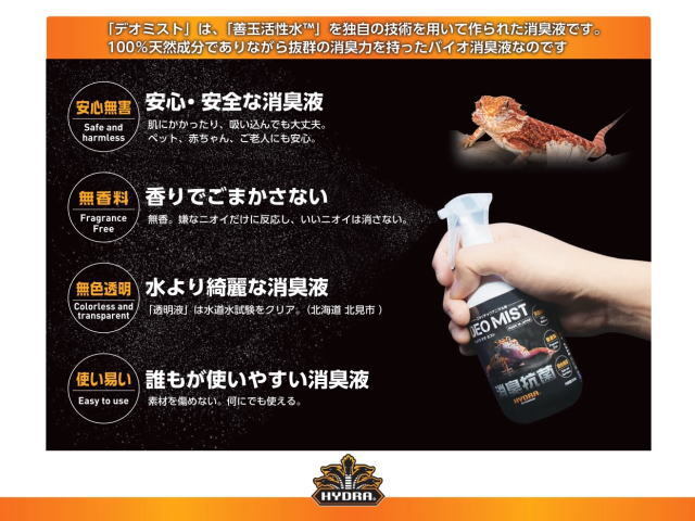 | 商品名:ヒュドラデオミスト300ml ■エキゾチックアニマル用消臭抗菌スプレー ・天然成分 ・無香料 ・安心無害 ・日本製 本品は環境微生物群を発酵培養することで生み出される 天然成分100%のバイオ活性水です。 消臭成分が悪臭に直接作用し分解させることから エキゾチックアニマル(爬虫類、小動物、鳥など)の 糞尿臭や腐敗臭に対して特に効果の高い消臭スプレーです。 また、悪玉菌を抑える抗菌作用もあります。 天然成分100%なので生体に安心無害です。 ■ご使用方法 使用する前に良く振ってからエキゾチックアニマルの 糞尿やケージ回り、ケージ内に直接1~2回スプレーして下さい。 臭いが気になる場合は多めにまた継続してスプレーして下さい。 生体に消臭スプレーがかかったり舐めても問題ありません。 ■内容量:300ml |