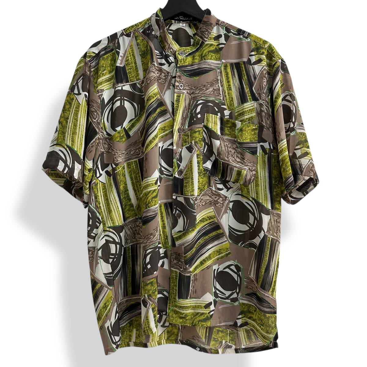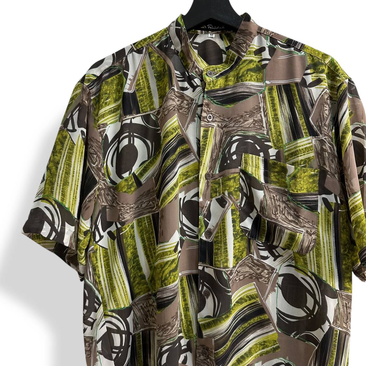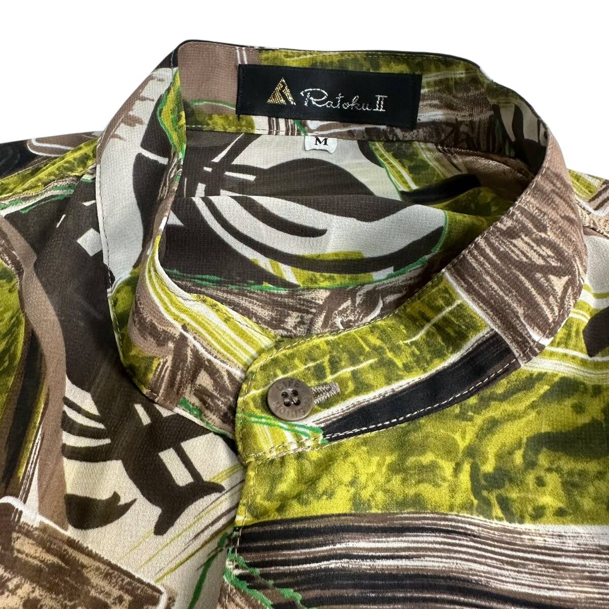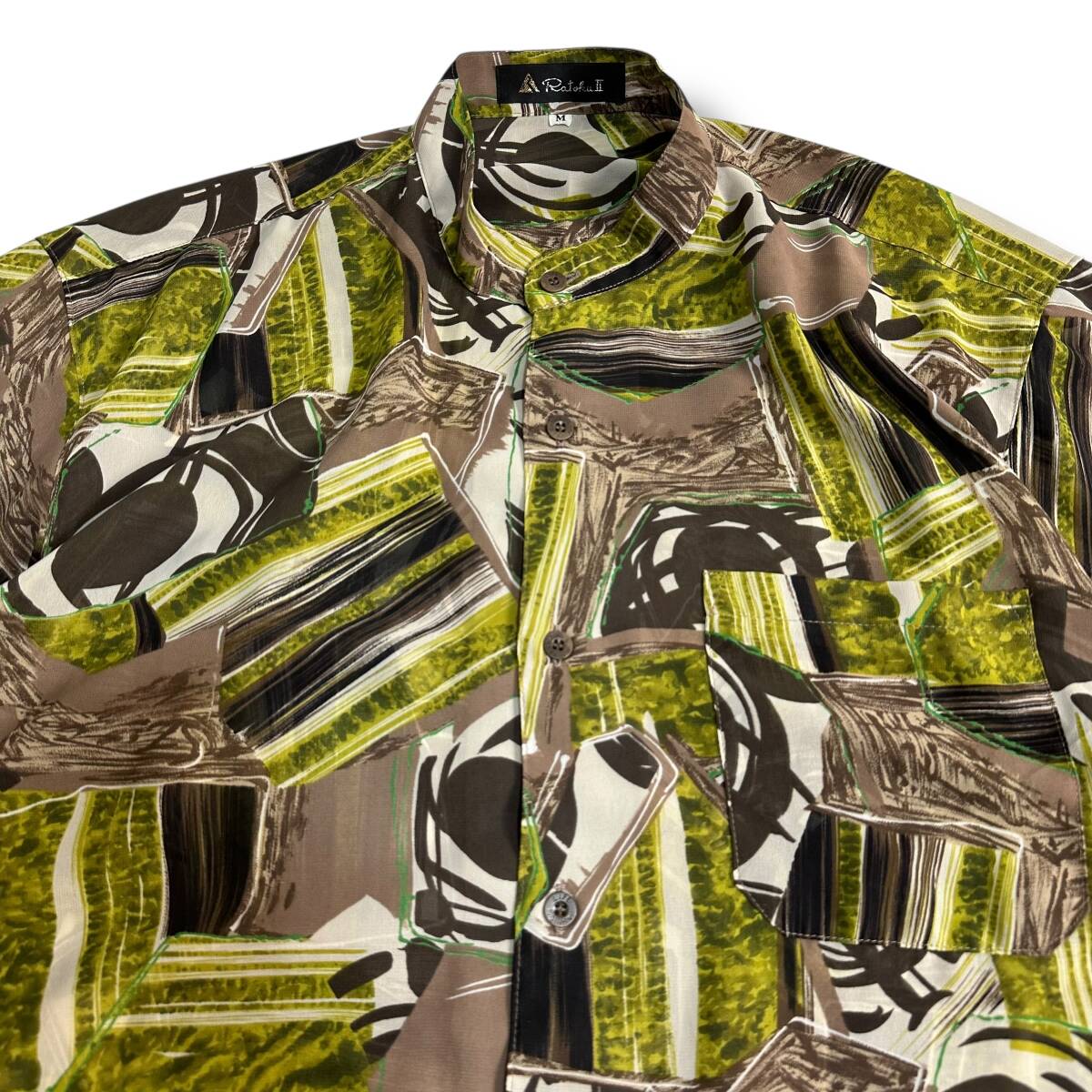 良好 貴重【Ratoku Ⅱ】VINTAGE 80s 90s 総柄 アートデザイン ポリエステル100% バンドカラー ビンテージシャツ シアーシャツ 個性的
