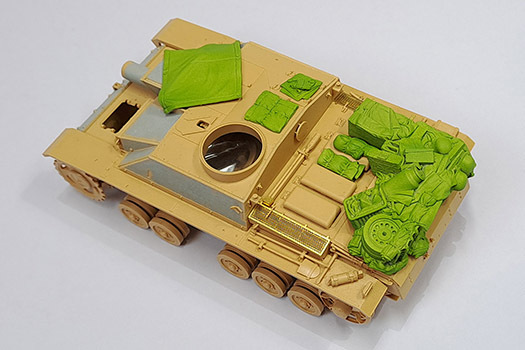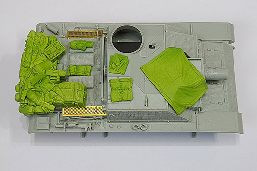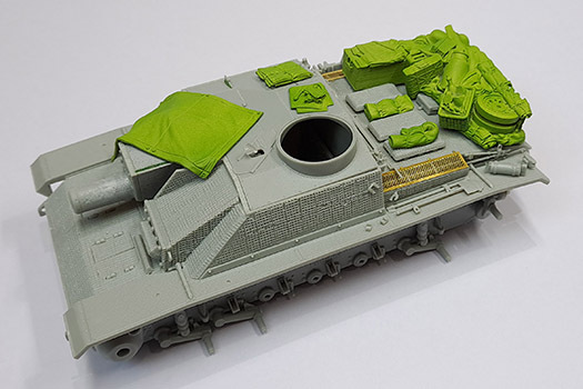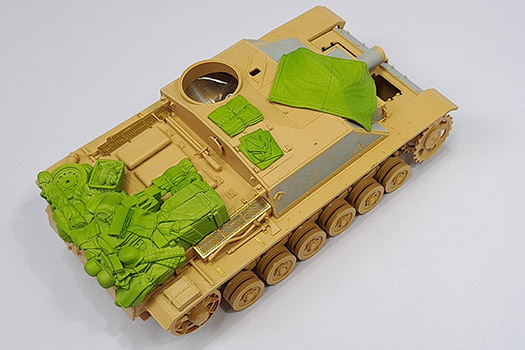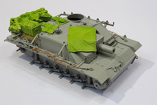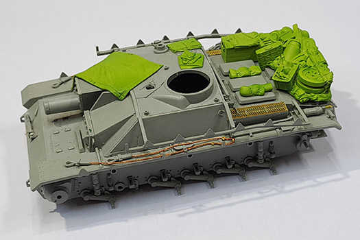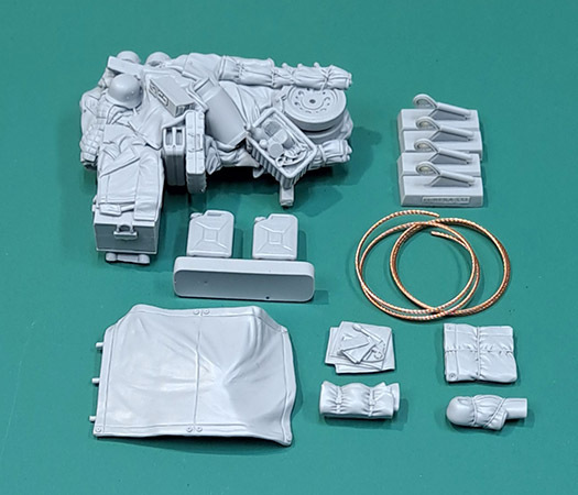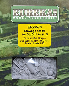 Eureka XXL ER-3573 1/35 Sug III Ausf. G Stowage Set in 1/35 scale. The set is suitable for models from manufacturers such as: RFM 5069, MiniArt 35336, Das Werk DW35021, Takom 8006. The set consists of 6 resin parts, two canisters and a set of tow cables (2 pcs.)