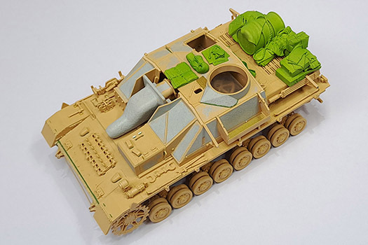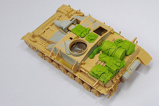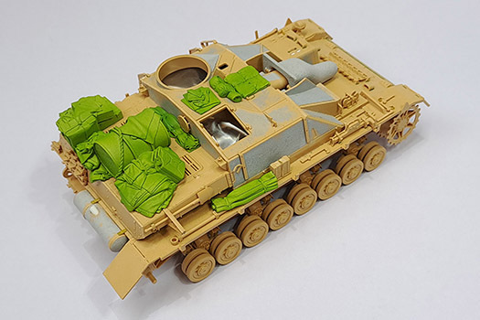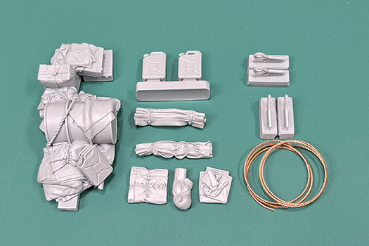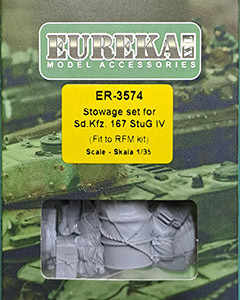 Eureka XXL ER-3574 1/35 Stowage set for Sd.Kfz. 167 StuG IV. The set is fit to the model: Rye Field Model cat no. 5060. The set consists of 6 resin elements, two canisters and a set of tow cables (2 pcs.)