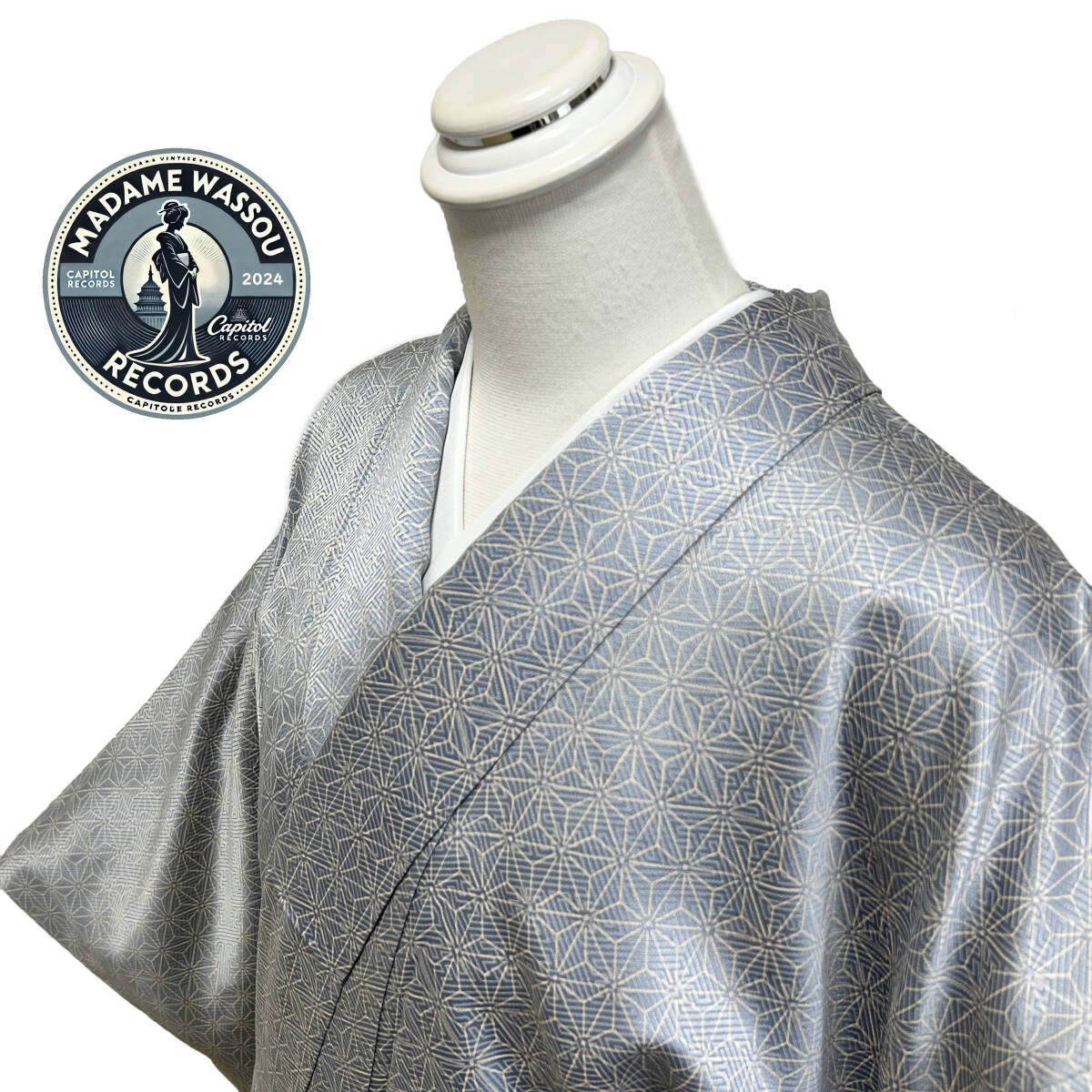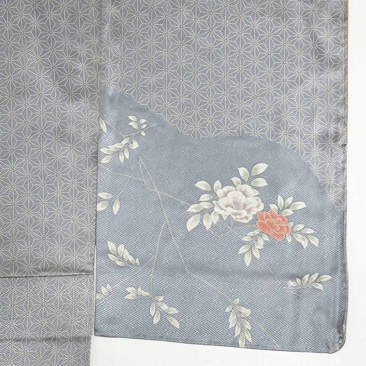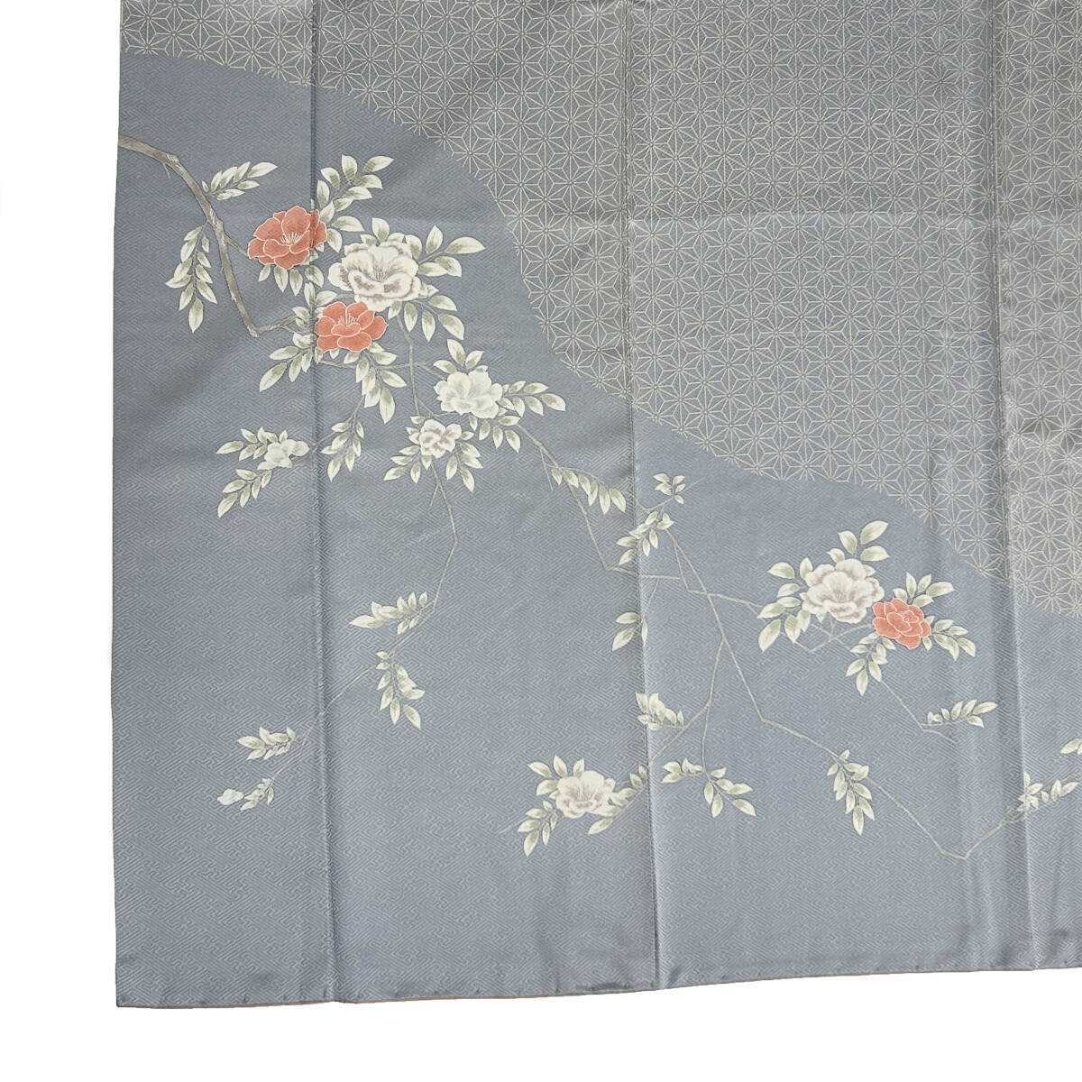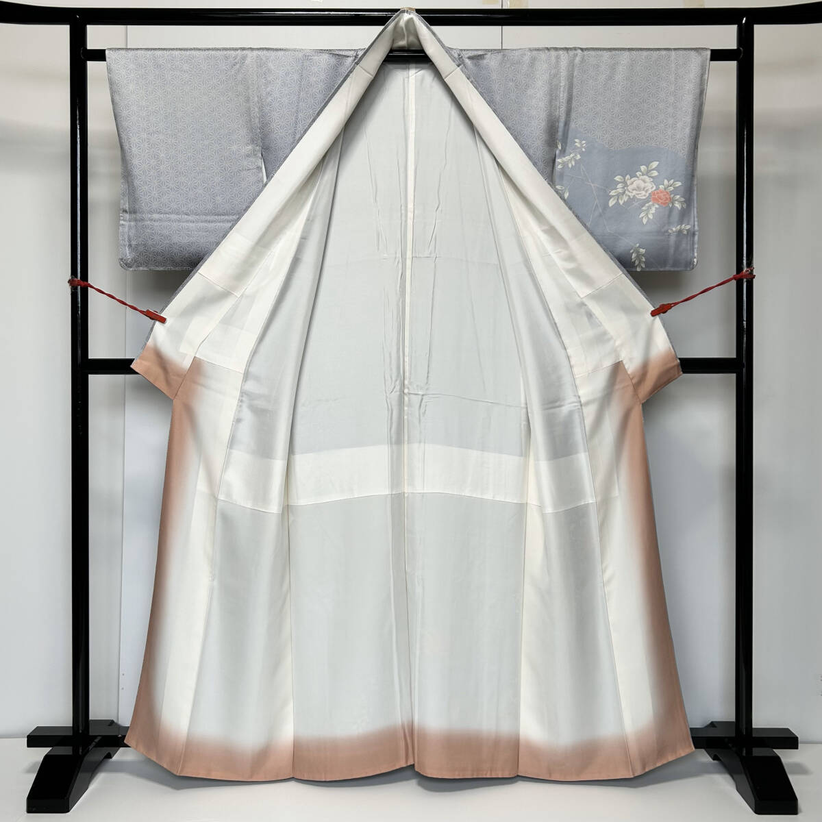 訪問着 着物 正絹 地紋 綸子 ブルーグレー 綺麗なお色 フォーマル 中古 仕立て上り Mサイズ MWR-No.117 10062025 マダム 和装