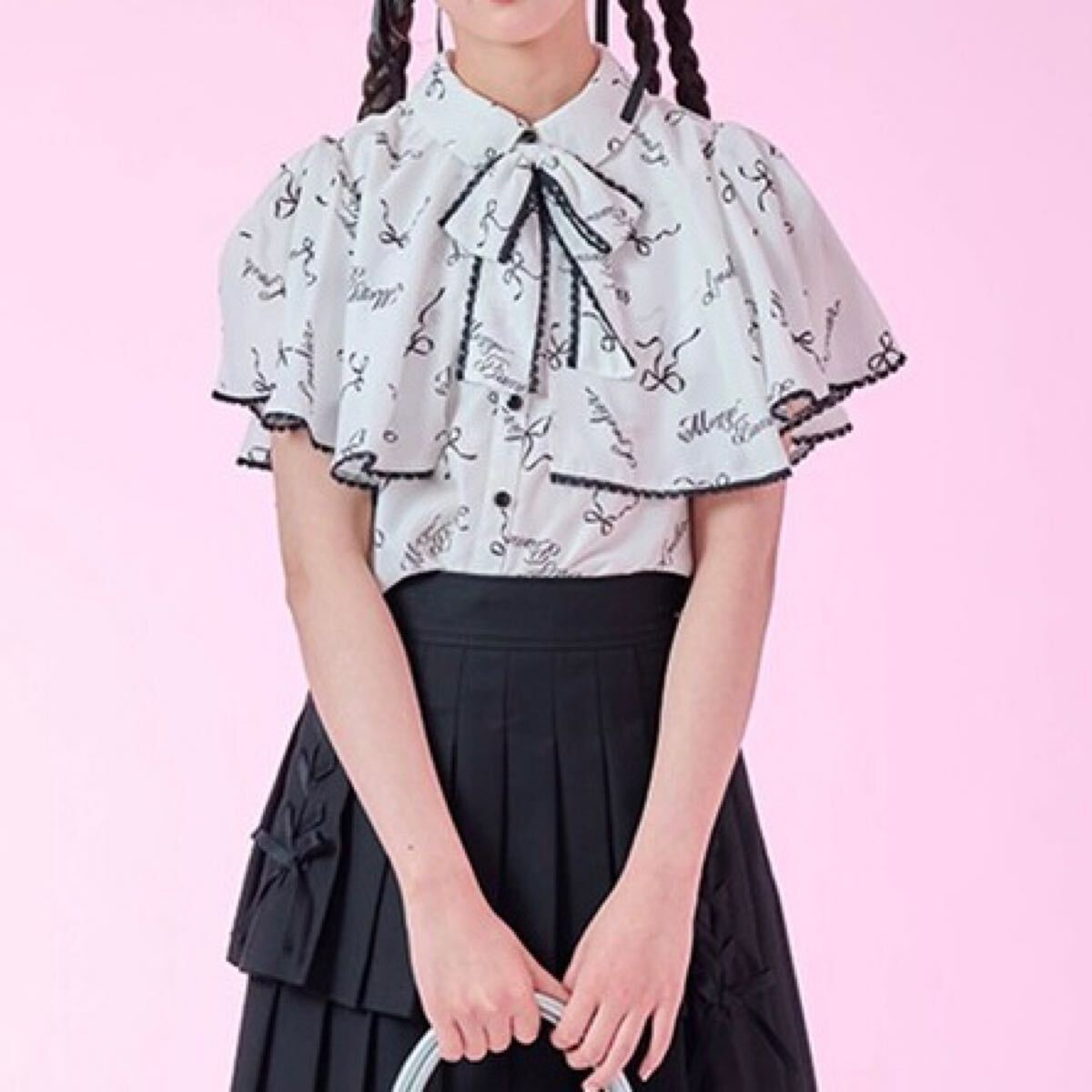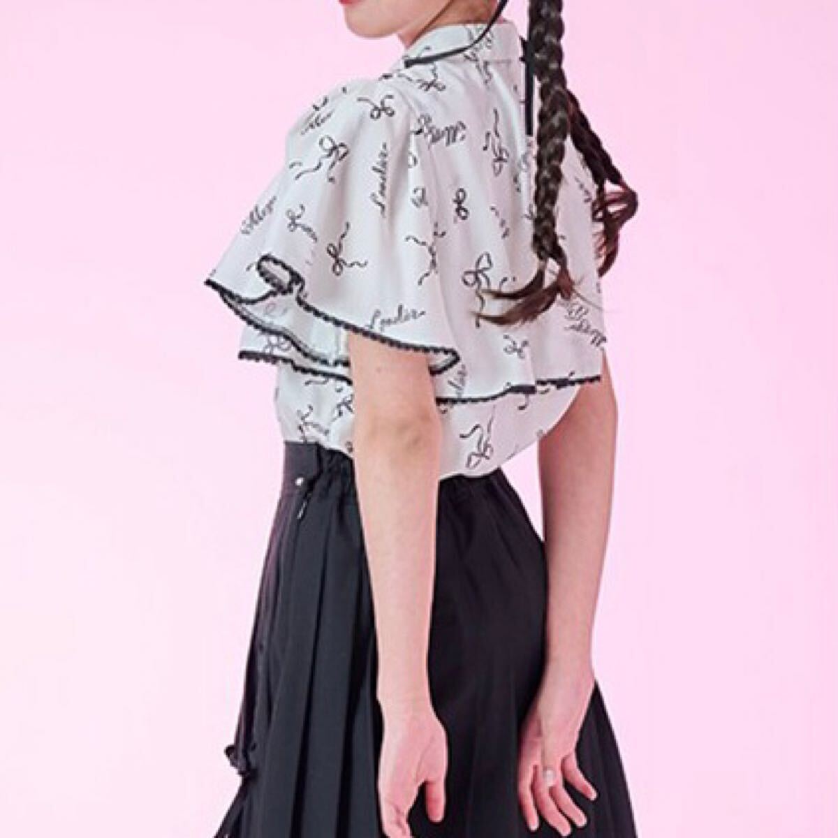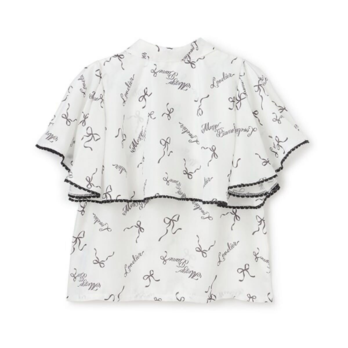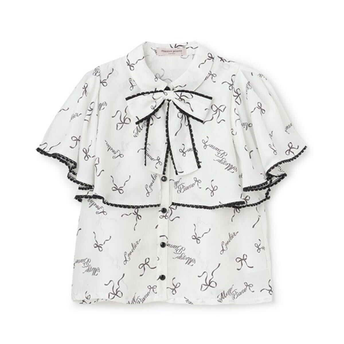 ケープラッフルデザインが着映えするボウタイつきのブラウスです。