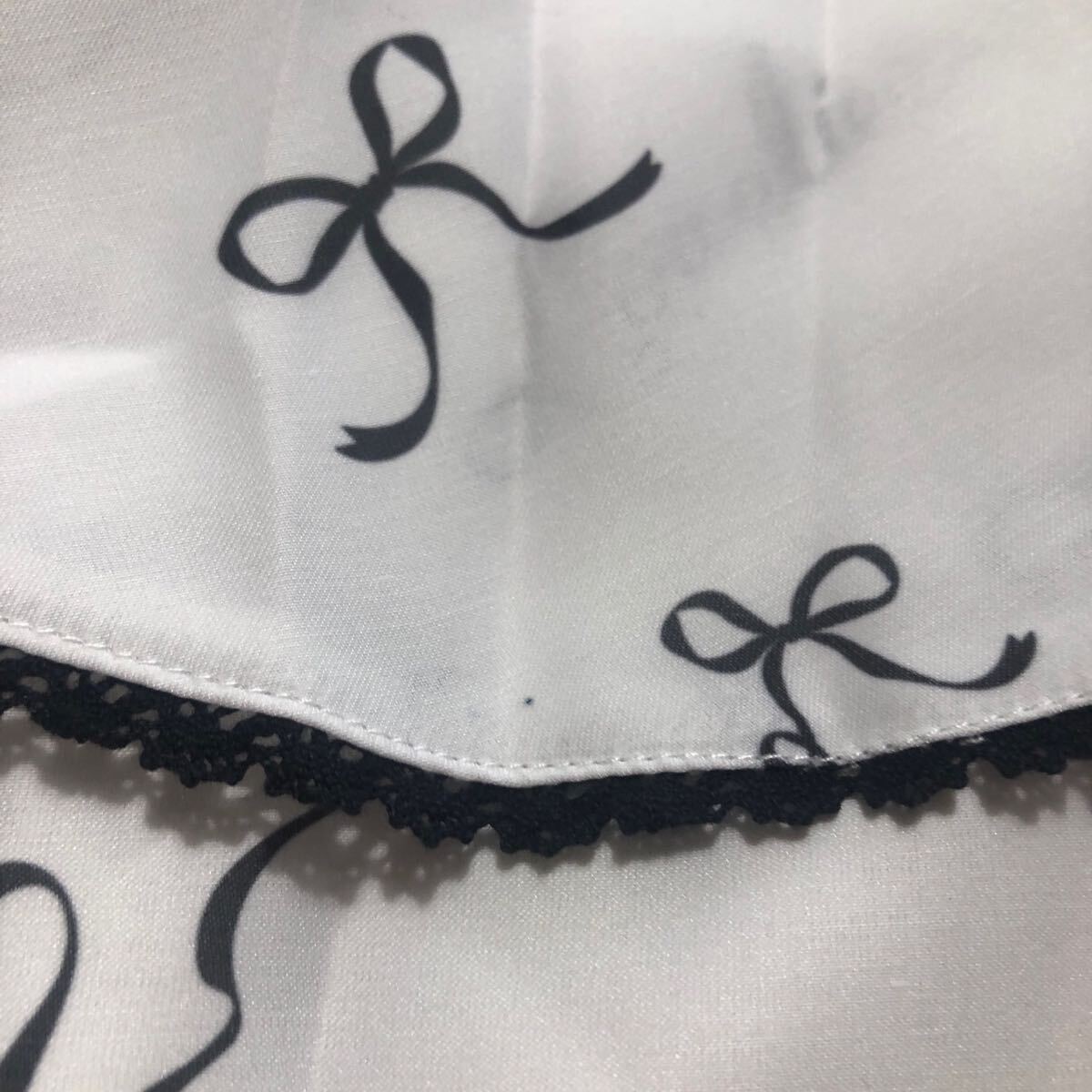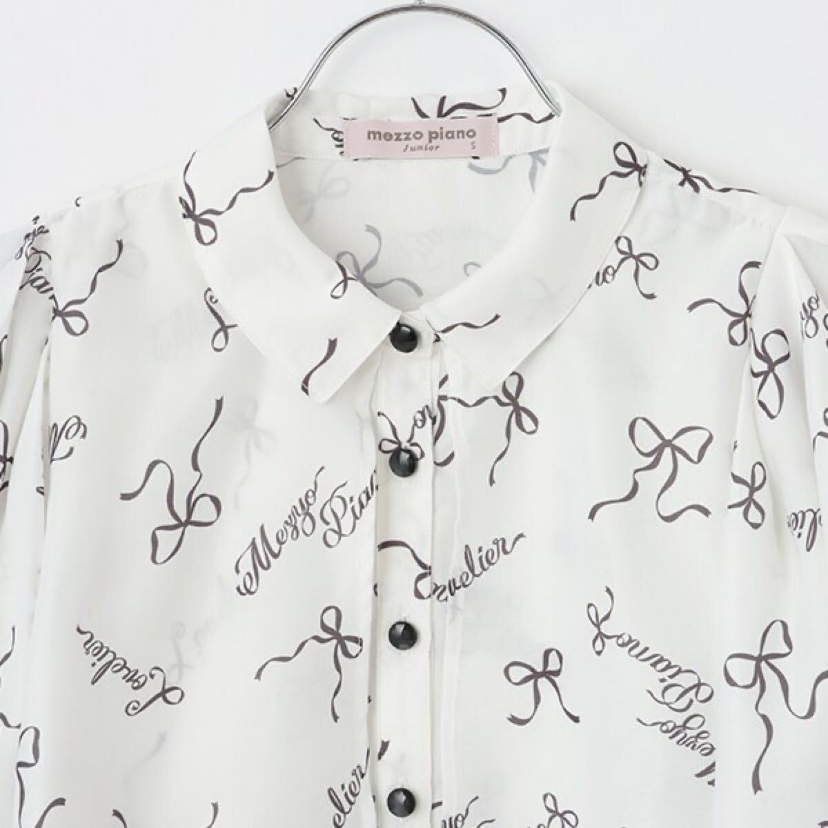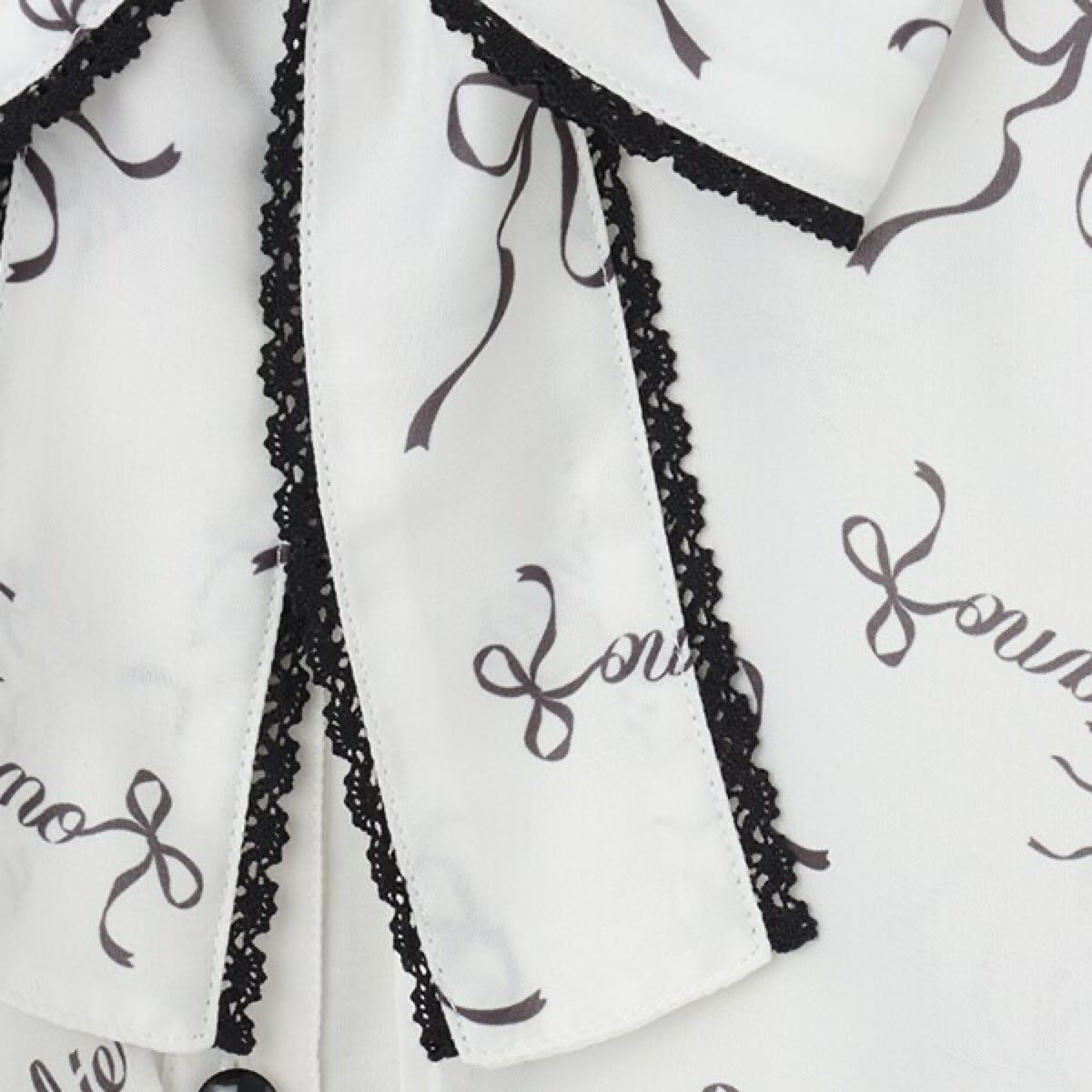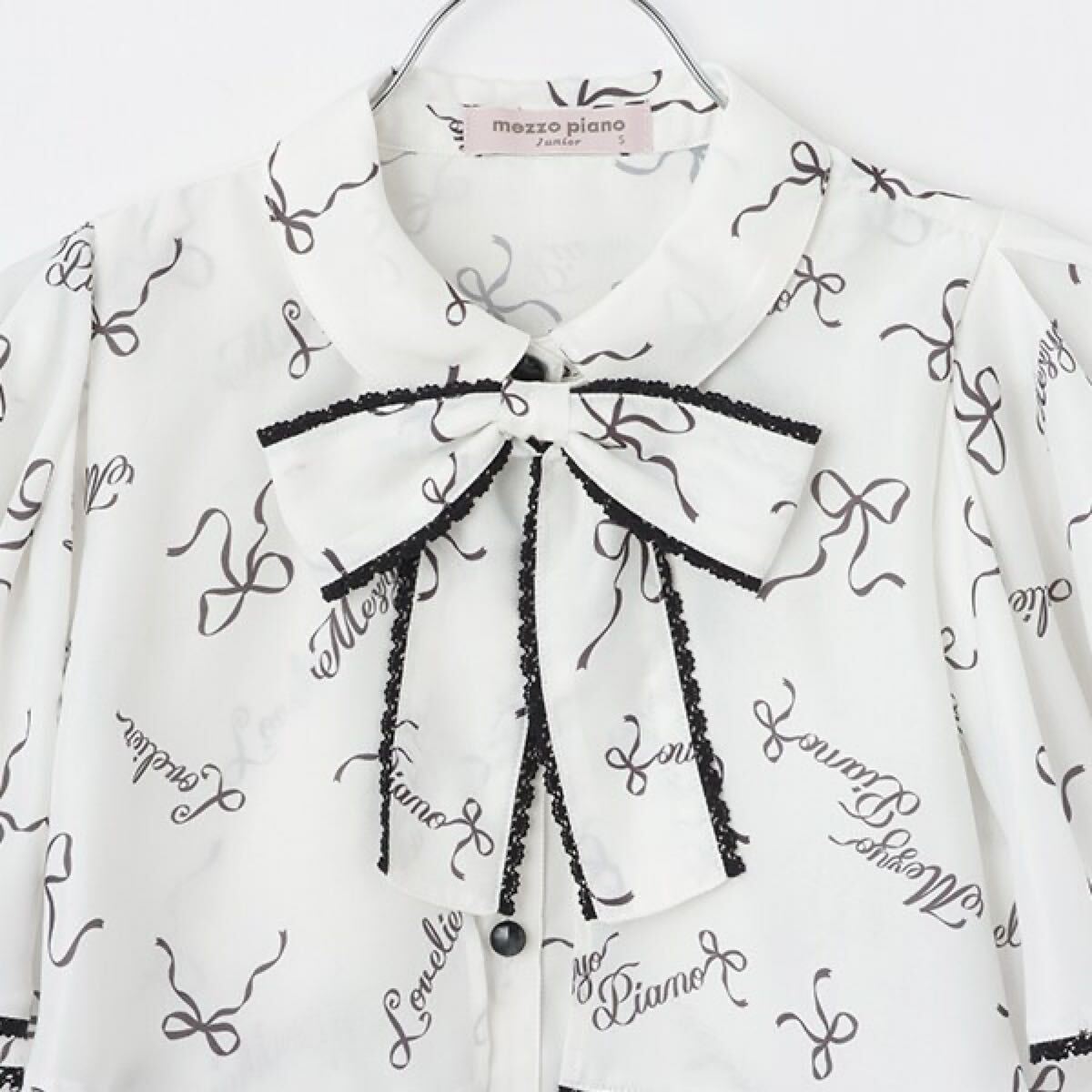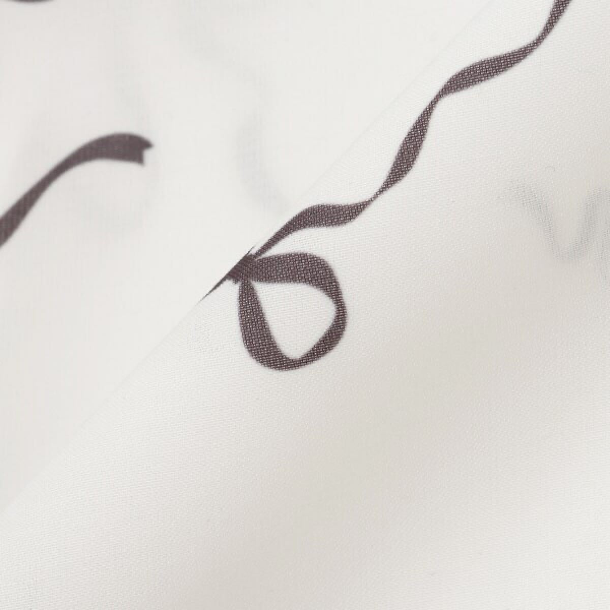 黒とライトブルーはさらりと軽やかな素材にリボンのロゴ柄をプリント。