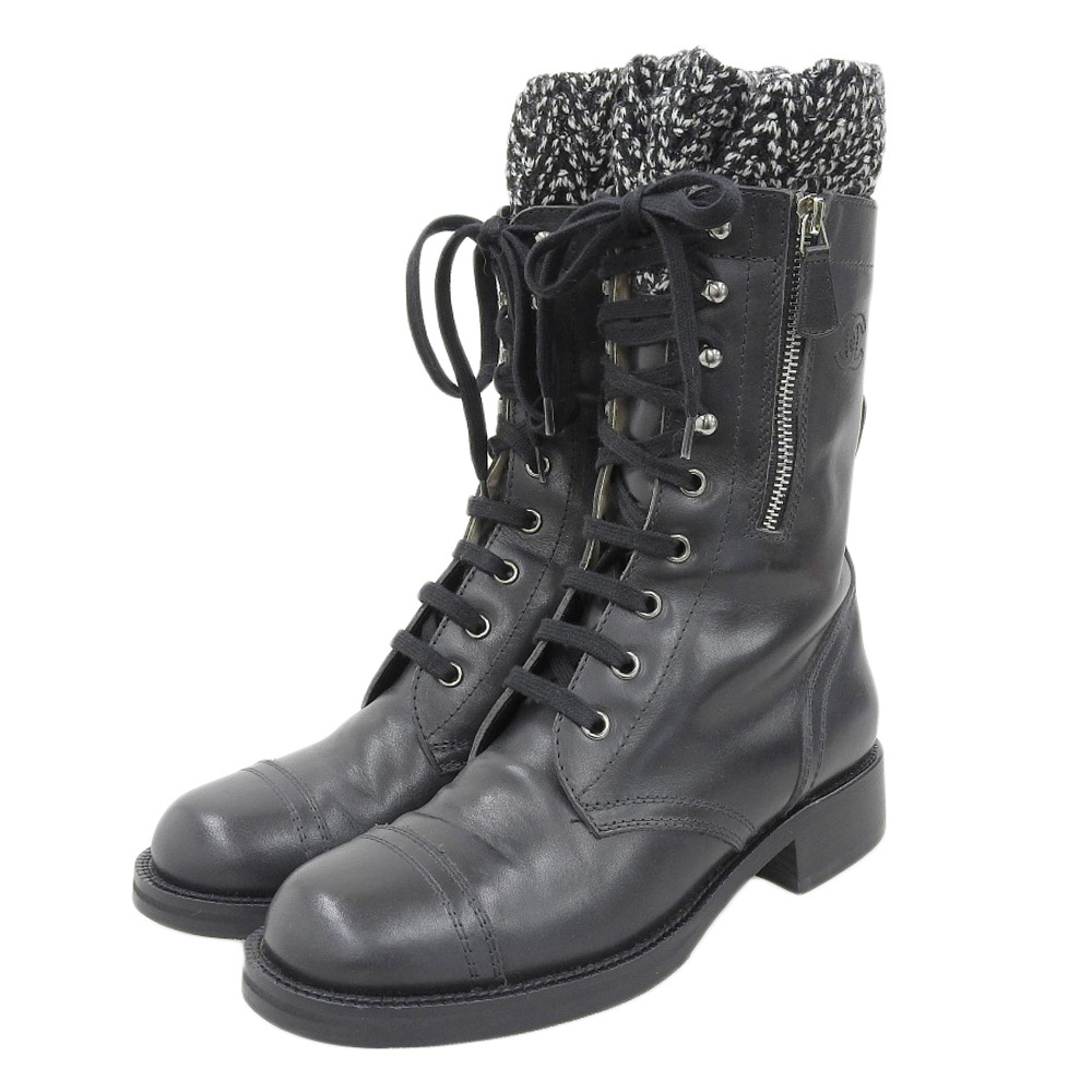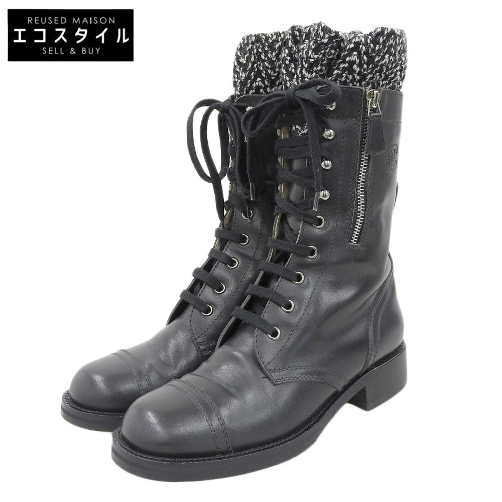商品名 シャネル 新品同様 CHANEL シャネル ココマーク レースアップ コンバットブーツ シューズ レディース レザー×ツイード ブラック 38 G27911シューズ