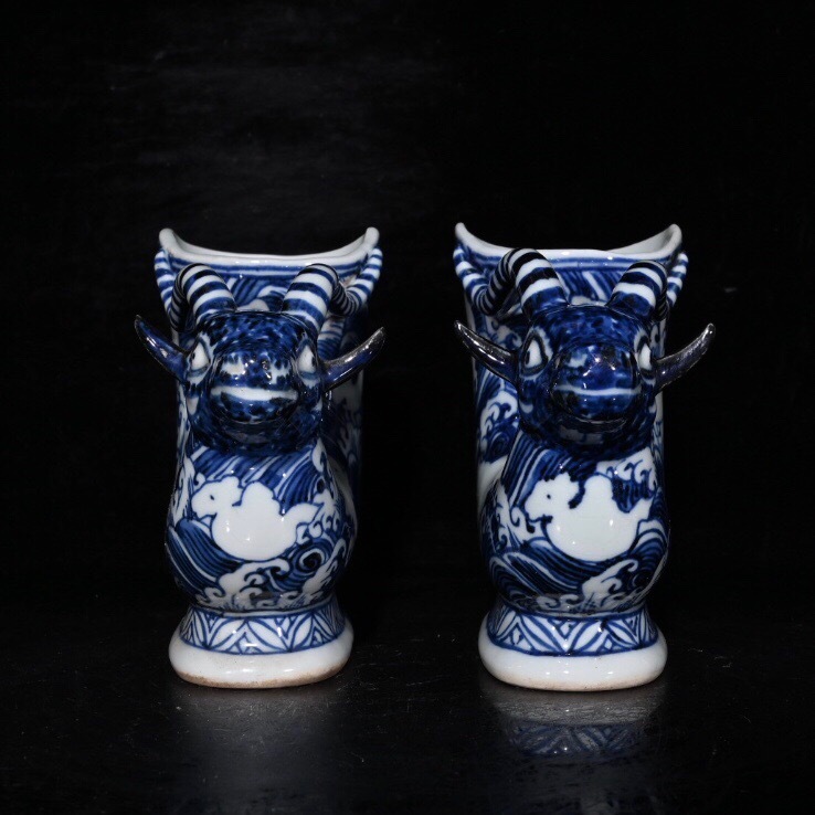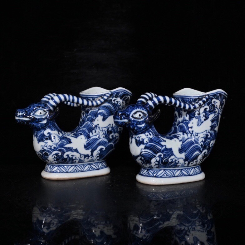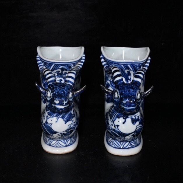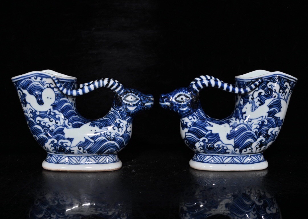 | 【古寶奇蔵】明・宣德年製款・古陶瓷品・青花・留白・羊角杯一對・陶藝・古董品・中国古玩・時代物・希少珍品・中国時代美術 |