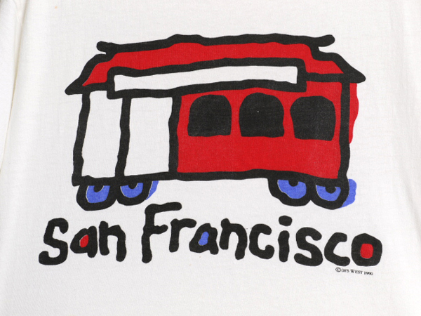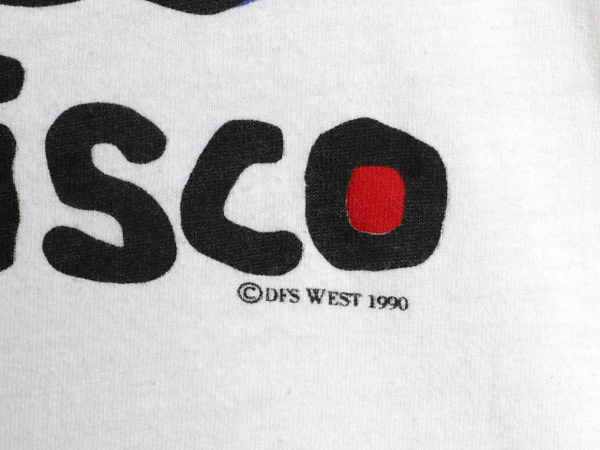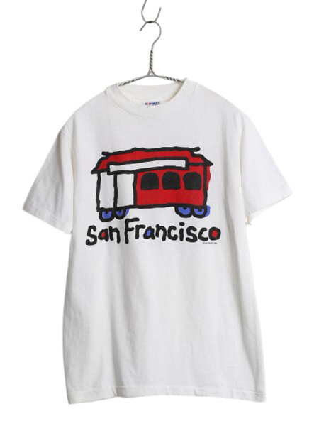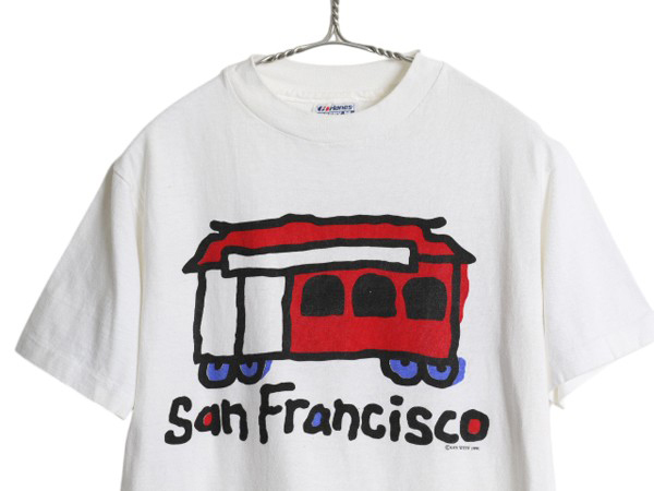 90年代のオールド グラフィック イラスト プリント Tシャツです。 ボディーは、Hanes (ヘインズ) 80年代の通称 青タグ MADE IN USA (アメリカ製) 素材は、100% COTTON (コットン) しっかりとしたヘビーウェイト 着心地抜群の素材が使用されています。 裾、袖、共にシングルステッチのヴィンテージボディ 合わせやすいホワイト フロントに、ポップアートを彷彿とさせる イラスト グラフィックプリント入り サンフランシスコの当時物のスーベニア ( 土産品 ) 物と思われます DFS WEST 1990のコピーライト入りオフィシャル 評価の高まるオールドのアートイラストTシャツ 古着でしか手に入らない、雰囲気の良い これだけで様になる商品です。 男女兼用で着て頂けます 実寸をご確認ください |