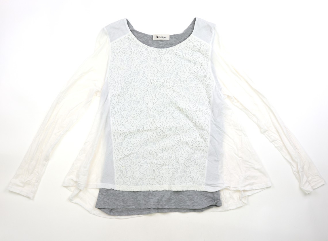 サイズ表記はありませんが、実寸は、肩幅約33.2 cm、サイドネックポイントから総丈約59.5 cm、胸囲約41.2cm(×2平置き実寸)、袖丈約60cm。薄手のカットソー生地で、身頃部分には授乳口付きの裏地があります。左肩や左胸の下に小さいシミがありますが、普段使いにいかがでしょうか。