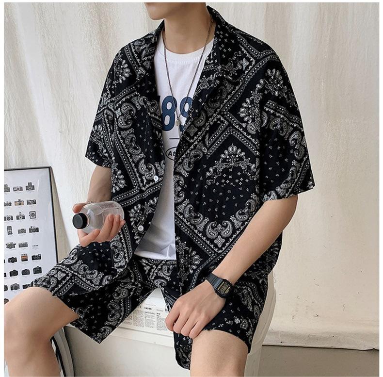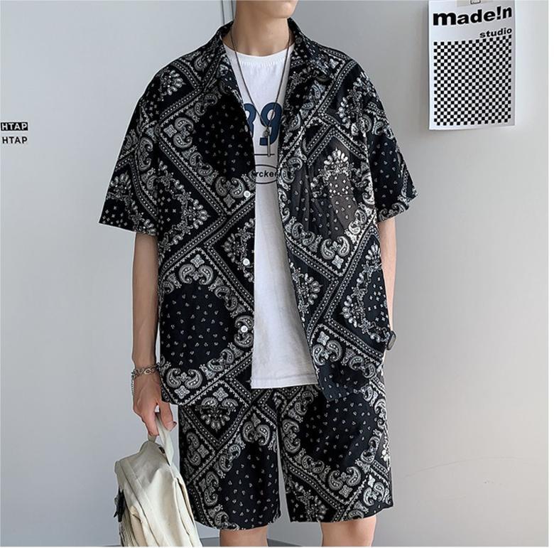 夏物 メンズ セットアップ ペイズリー柄 上下セット ペイズリー バンダナ 涼しい 半袖シャツ ブラック M