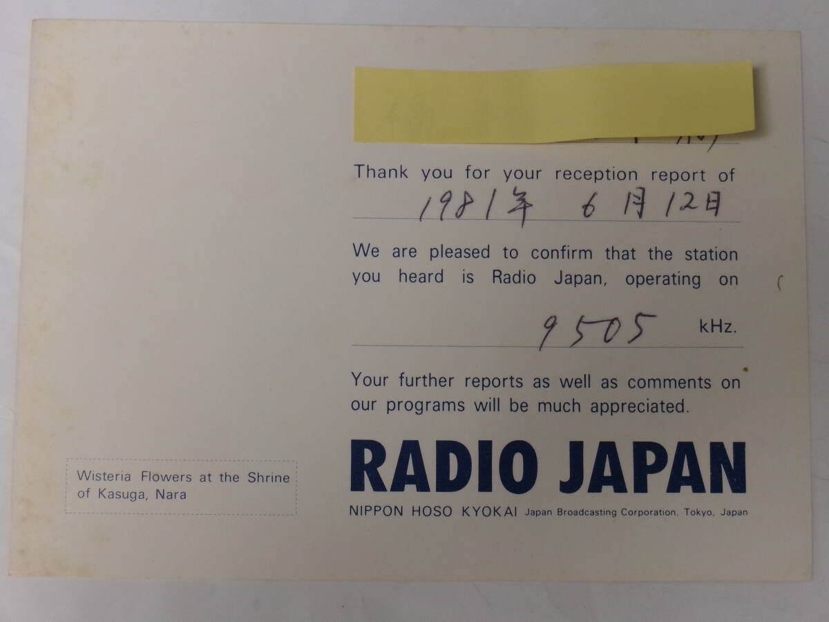 「ラジオ ジャパン・Radio Japan(NHK 国際放送)・ベリカード」 1981年発行 です。