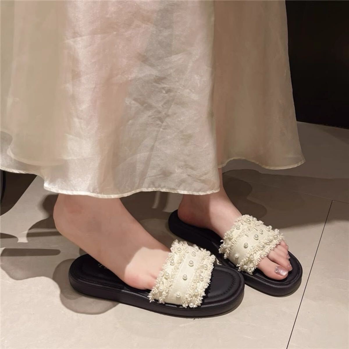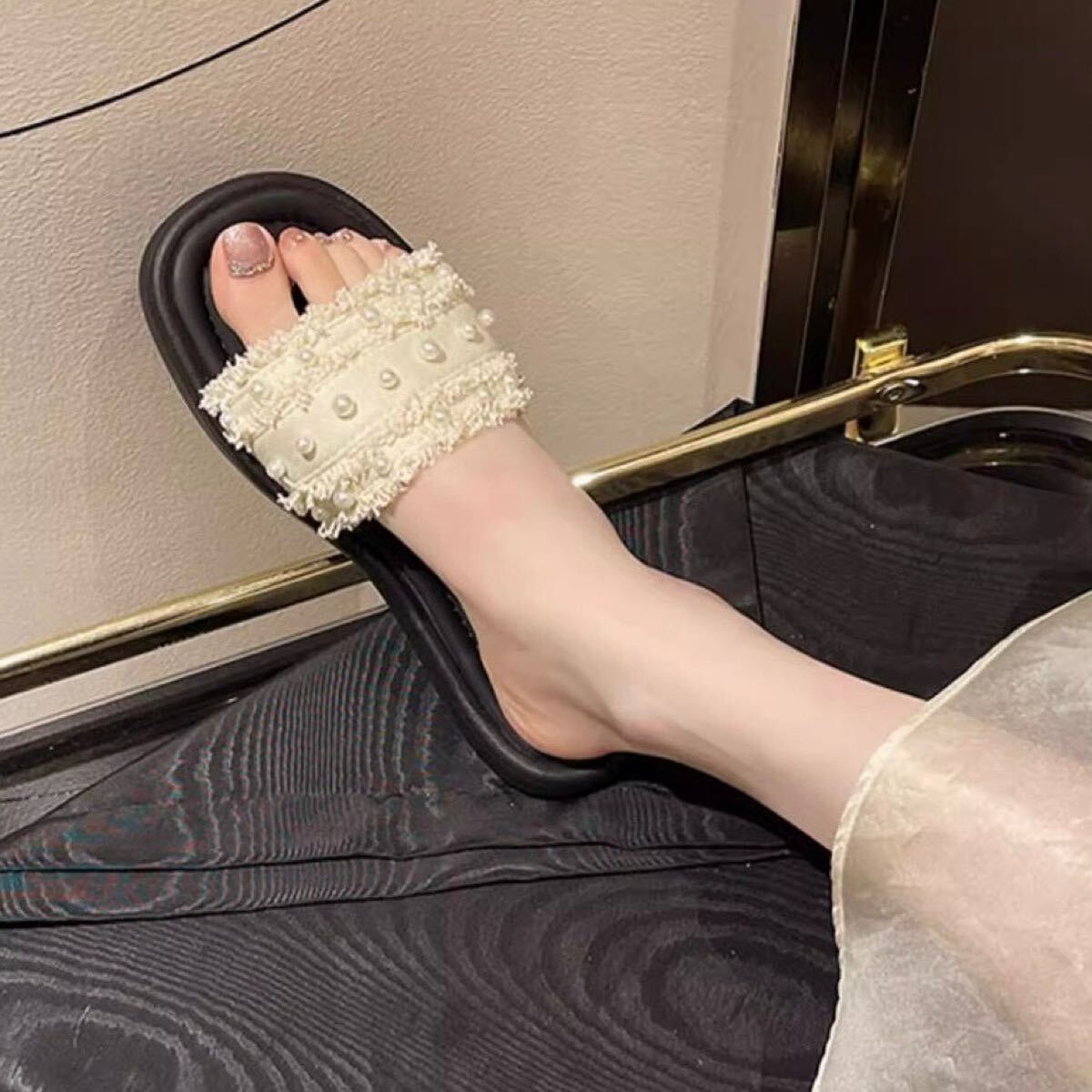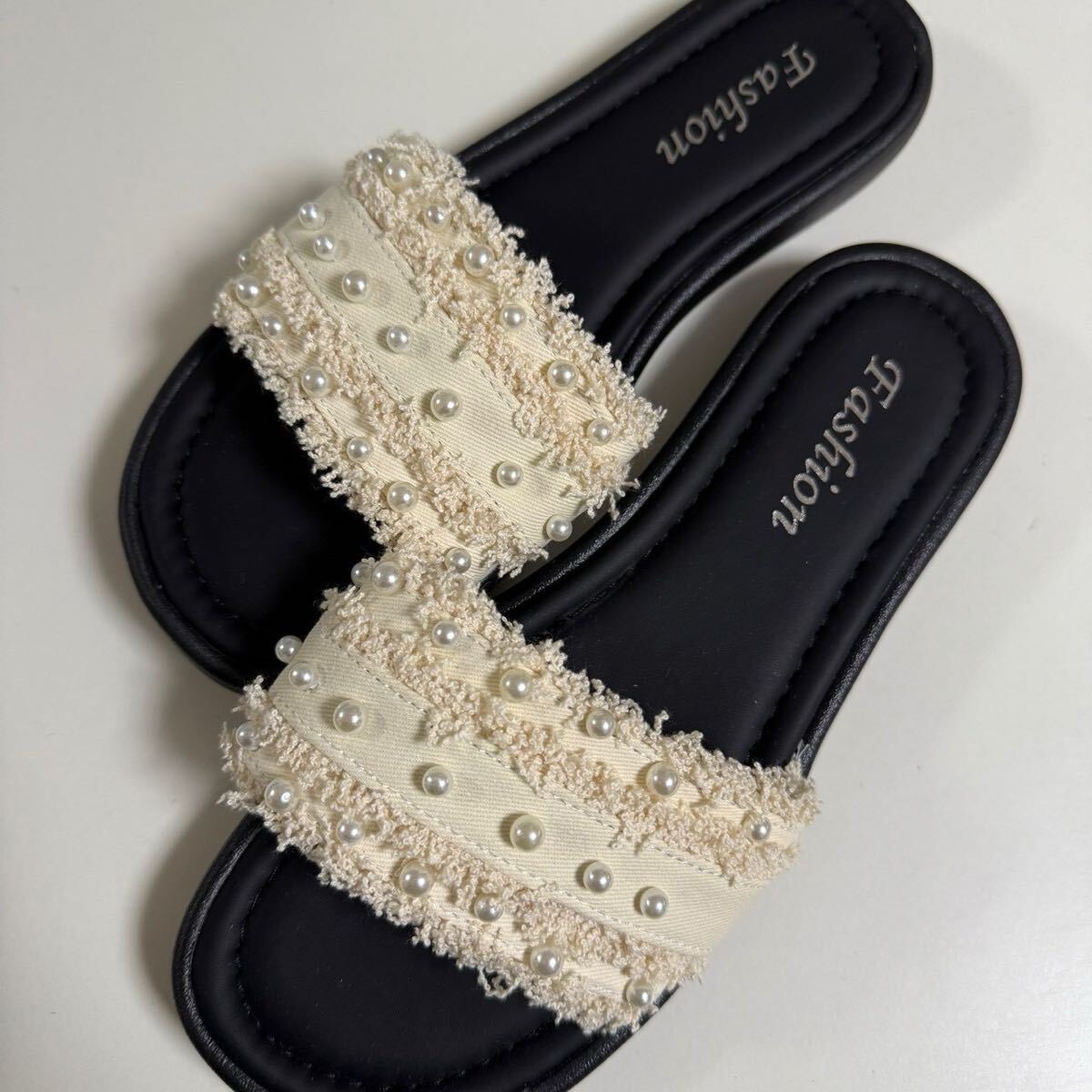 華やかさと上品さを兼ね備えたパール付きツイードスライドサンダル。